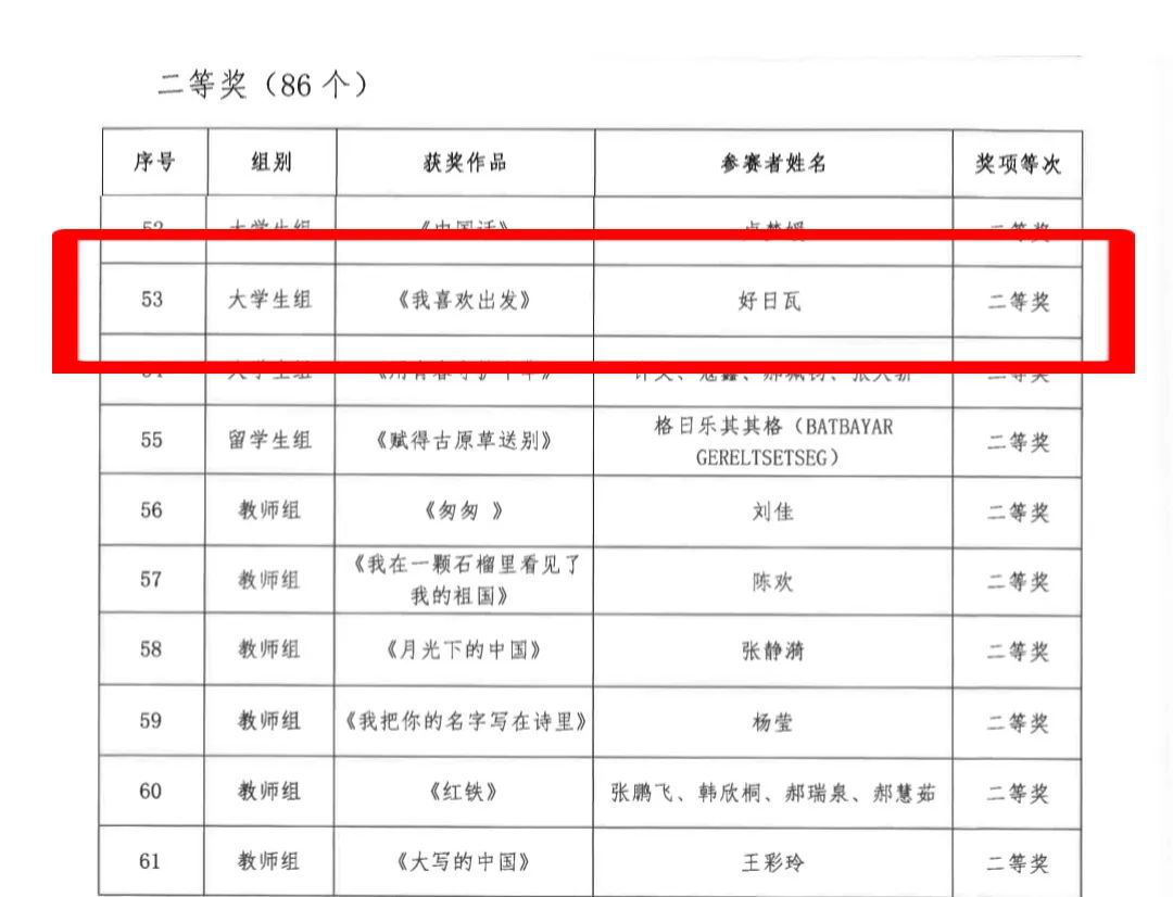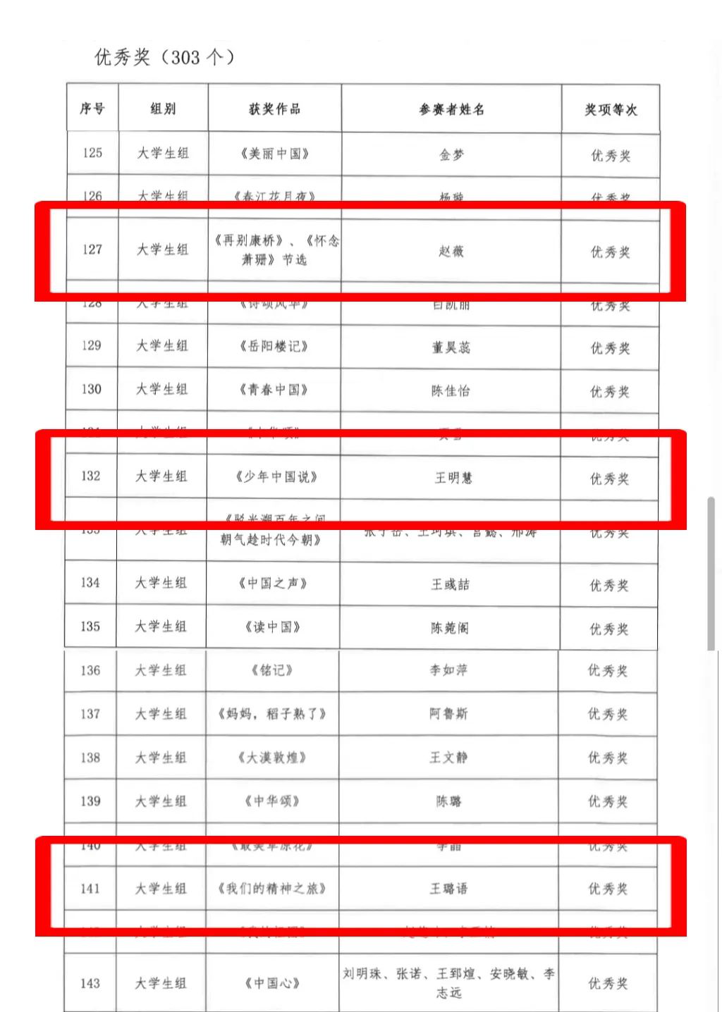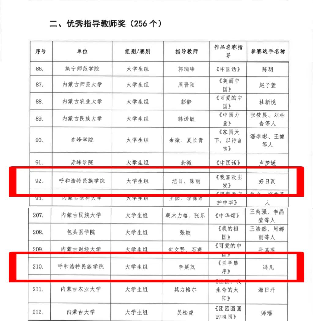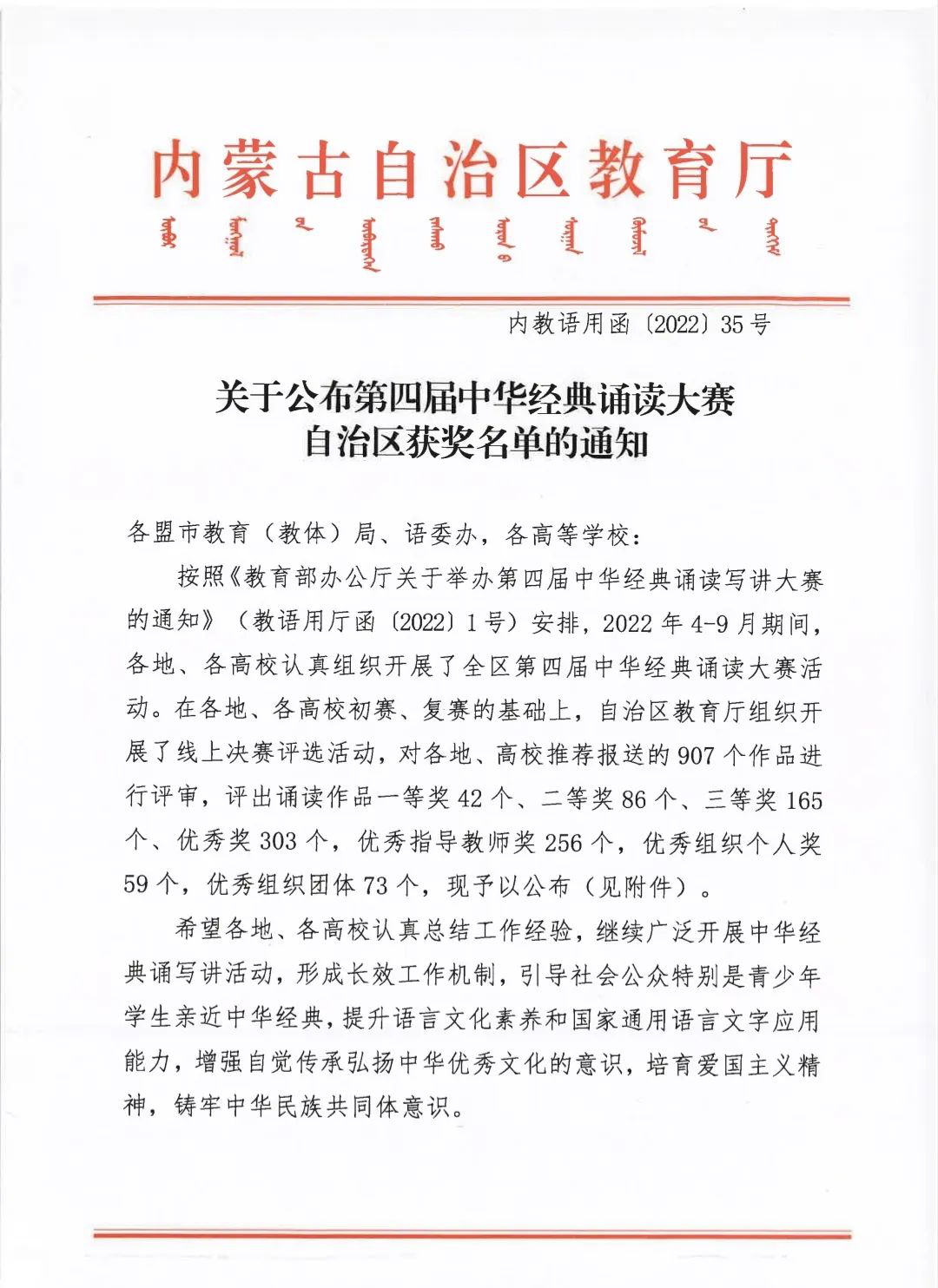 近日,内蒙古自治区教育厅发布了第四届中华经典诵读大赛自治区获奖名单。鸭脖选送的新闻传媒学院好日瓦同学的参赛作品《我喜欢出发》荣获全区二等奖,经济管理学院冯凡同学的参赛作品《兰亭集序》荣获三等奖,文学院赵薇同学的参赛作品《再别康桥》(《怀念萧珊》节选)、公共管理学院王明慧同学的参赛作品《少年中国说》、文学院王璐语同学的参赛作品《我们的精神之旅》荣获优秀奖,新闻传媒学院团总支书记旭日、新闻传媒学院学工办主任珠丽、经济管理学院团总支书记李延茂荣获“优秀指导教师”荣誉称号。