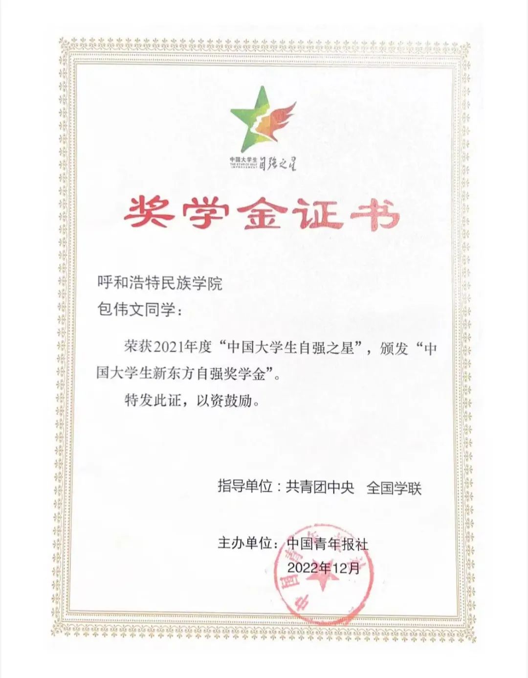 近日,由共青团中央、全国学联指导,中国青年报社、新东方教育科技集团、中国青年创业就业基金会联合举办的2021年度“中国大学生自强之星”寻访活动结果揭晓,鸭脖包伟文同学荣获“中国大学生自强之星”称号。