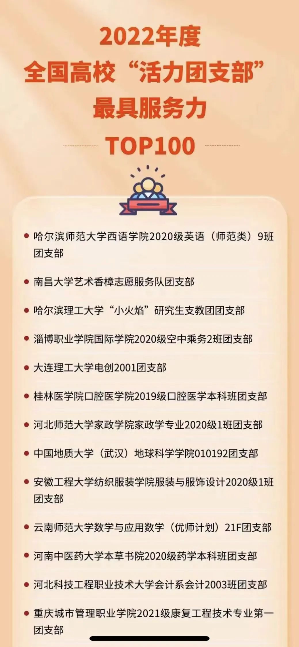 据悉,2022年度全国高校“活力团支部”风采展示活动由团中央基层建设部指导、中国青年报社开展,在引领力、组织力、服务力、贡献度、改革味、好作风6个方面,通过新媒体方式集中展现高校团支部改革建设成果和典型经验,深入贯彻“全团抓思想政治引领”“全团大抓基层”“全团抓学校”工作部署,提高高校团支部影响力。经过校内选树、校级展示、省级展示、全国展示等环节,形成TOP100榜单。