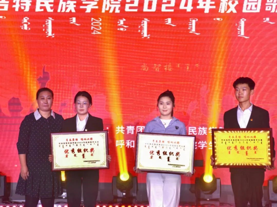 最终,音乐学院包永光获得专业组一等奖、陈曦获得专业组二等奖、乔博获得专业组三等奖;基础教育学院李泽雅获得非专业组一等奖,蒙古学学院乌达布拉其其格、学前教育学院娜和雅获得非专业组二等奖,新闻传媒学院伊德日、外国语学院乌亚汗、文学院乌雅汗获得非专业组三等奖;音乐学院都希格、化学与环境学院苏米芽等10名同学获得优秀奖;美术学院朵兰获得“最佳台风奖”;文学院乌雅汗获得“最具网络人气奖”;音乐学院、公共管理学院、计算机科学学院获得“优秀组织奖”。