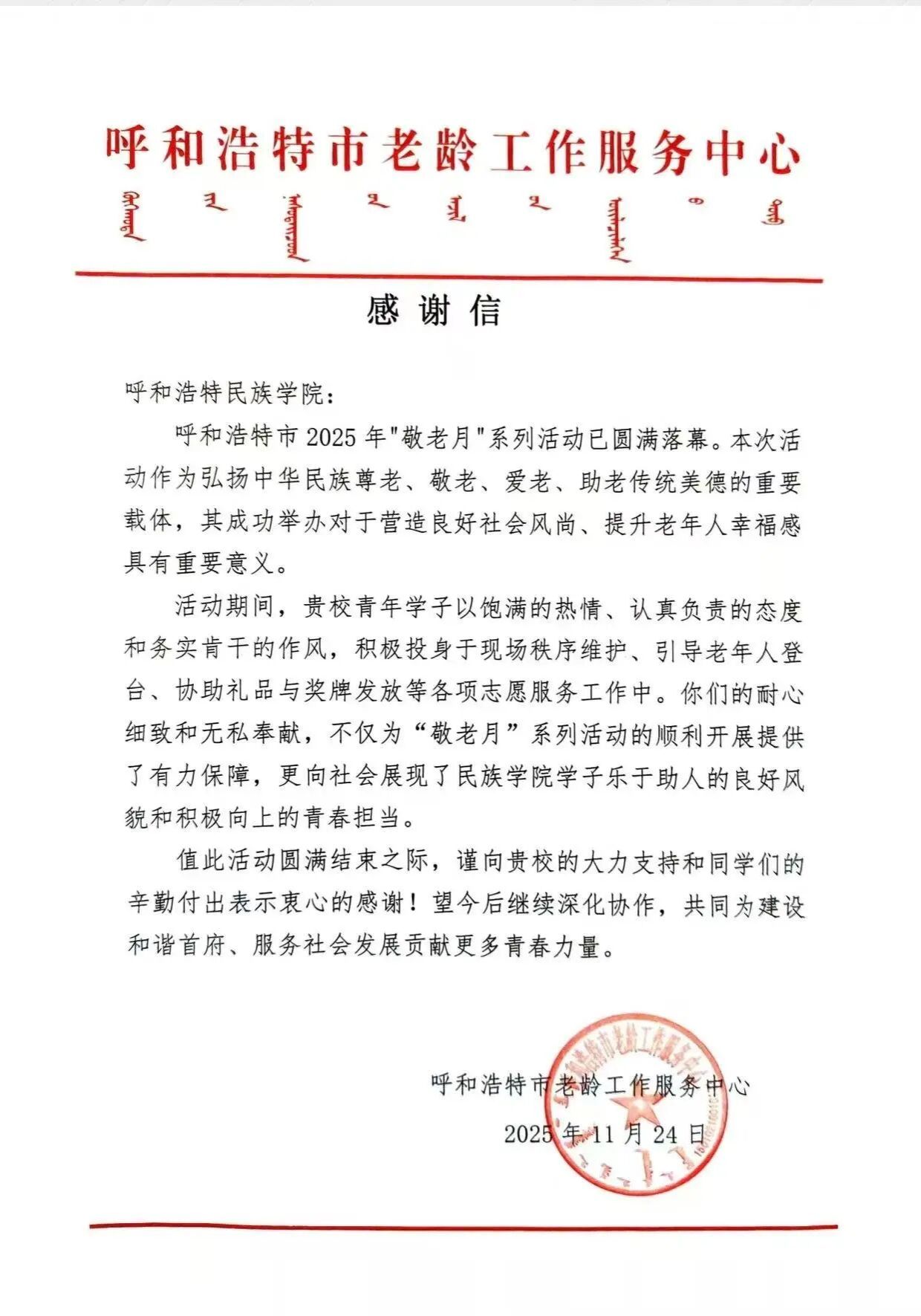近日,呼和浩特市老龄工作服务中心向鸭脖发来感谢信,对青年学子在2025年“敬老月”系列活动中的无私奉献与出色表现给予高度肯定。