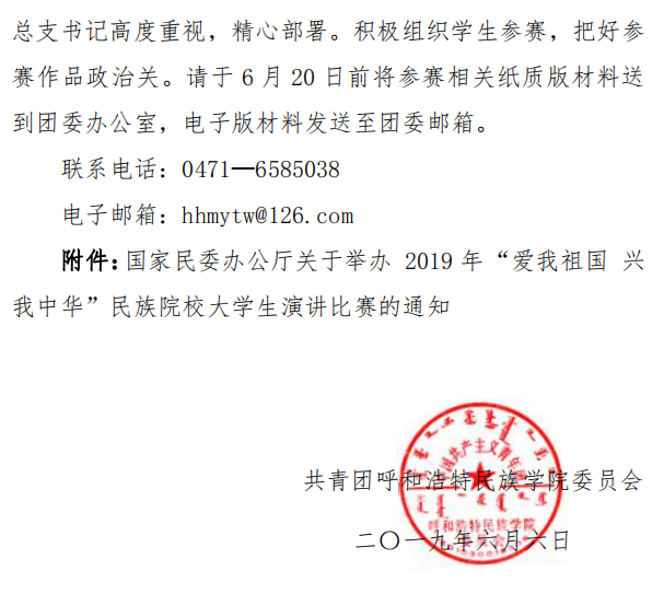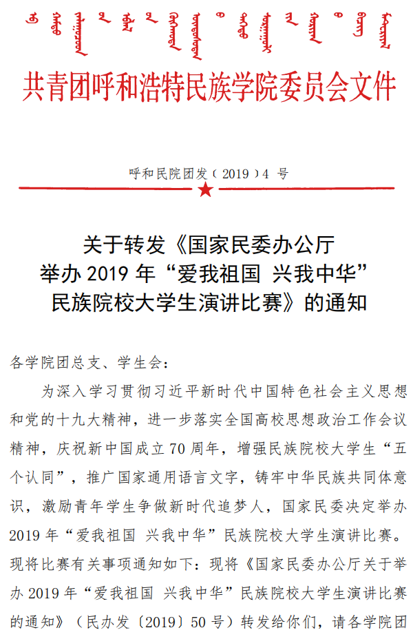 关于转发《国家民委办公厅举办2019年“爱我祖国 兴我中华”民族院校大学生演讲比赛》的通知