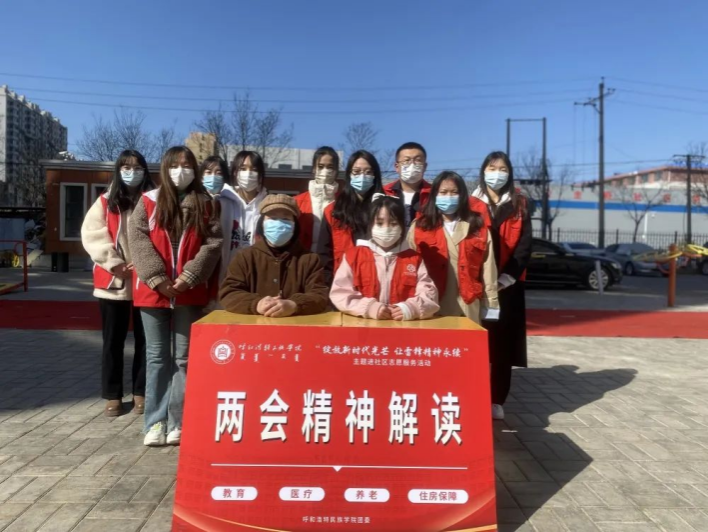 来自马克思主义学院的师生志愿者在社区向居民讲解两会精神以及惠民政策,加深民众对教育、养老、医疗、住房保障等方面国家政策的理解,了解新政策带来的变化。