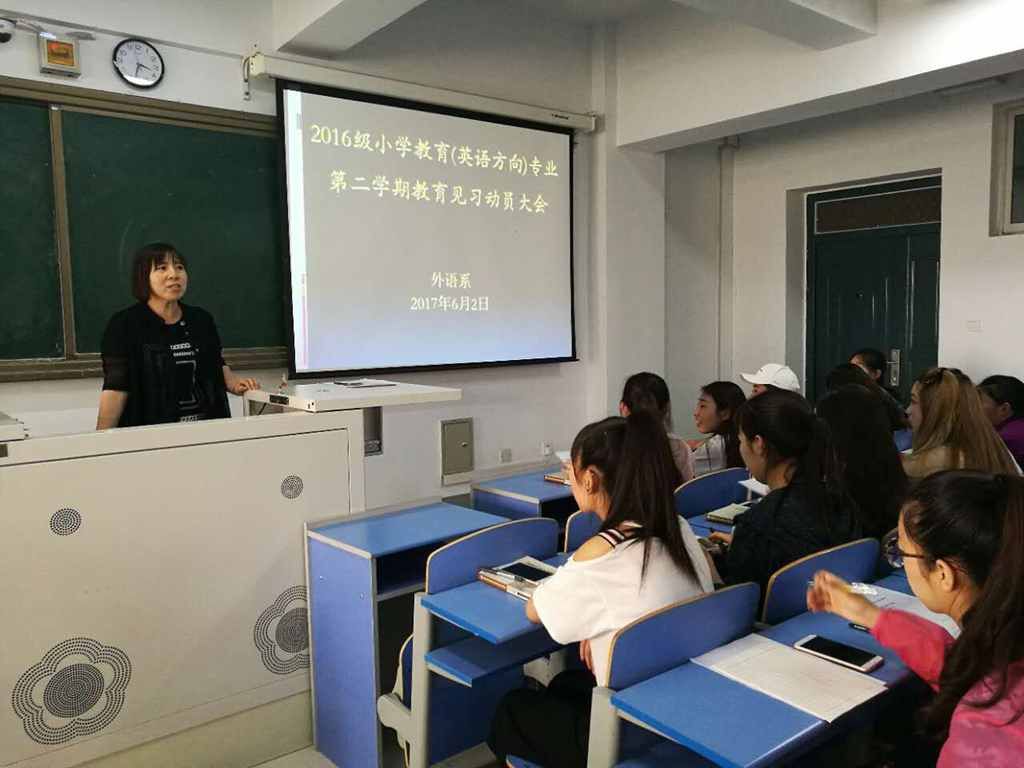 2017年6月2日下午3:20分,外语系在都林楼522教室举行了2016级小学教育(英语方向)专业第二学期教育见习动员大会。会议由外语系教学秘书高乌兰老师主持,见习指导教师和2016级小学教育(英语方向)专业110名学生参加了动员大会。