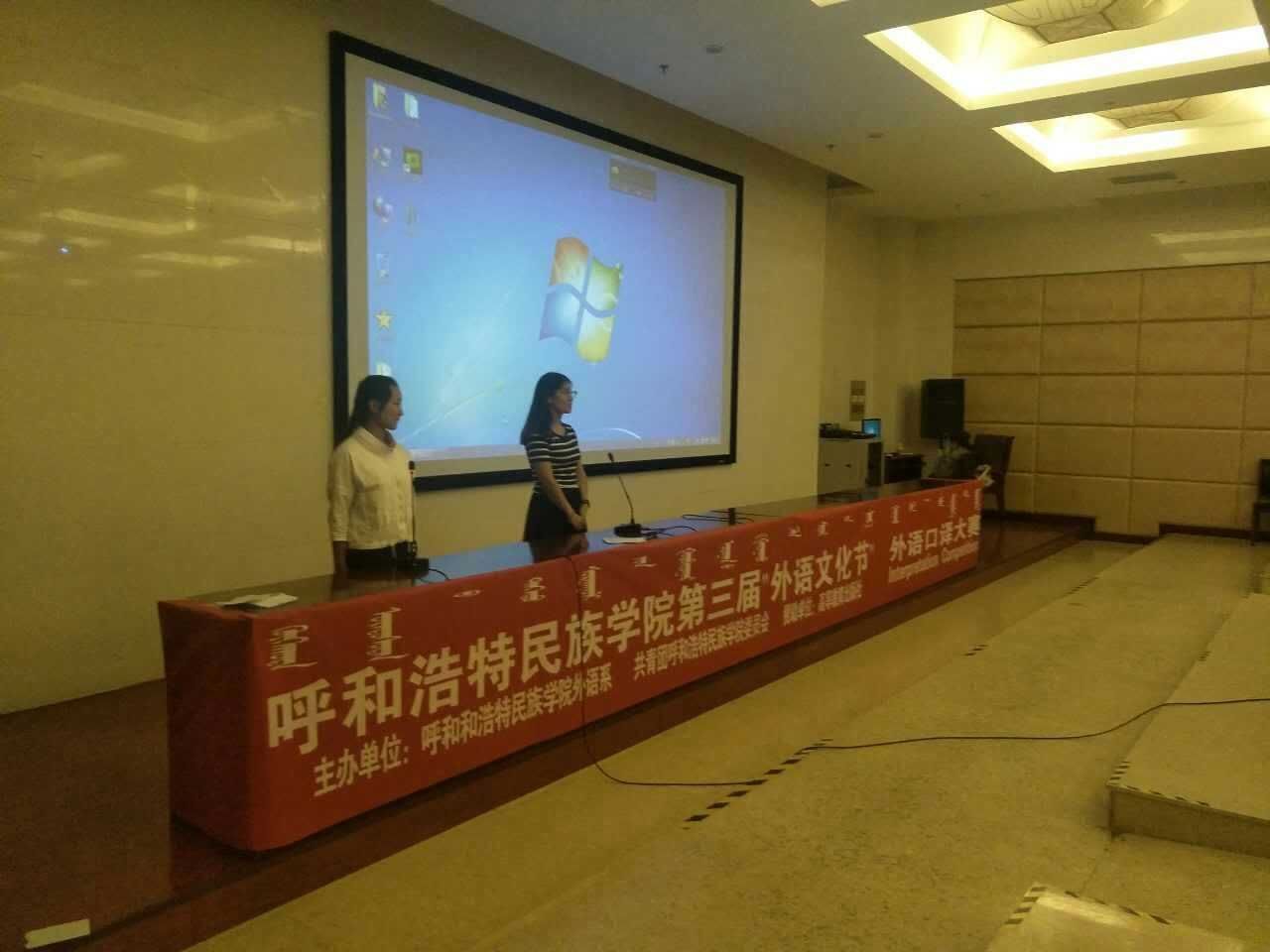 为进一步增强校园学习氛围,丰富和活跃第二课堂活动,检验鸭脖学生运用外语的综合能力,2017年6月22日晚,由高等教育出版社赞助,外语系、校团委主办,公共外语教研室承办的YABO鸭脖第三届“外语文化节”系列活动之一的外语口译大赛在学校图书馆一楼报告厅拉开帷幕。大赛特邀敖登副教授、陈永清老师、涛歌老师、萨仁其其格老师担任评委,朝木尔勒格老师担任本次大赛的主持人。
