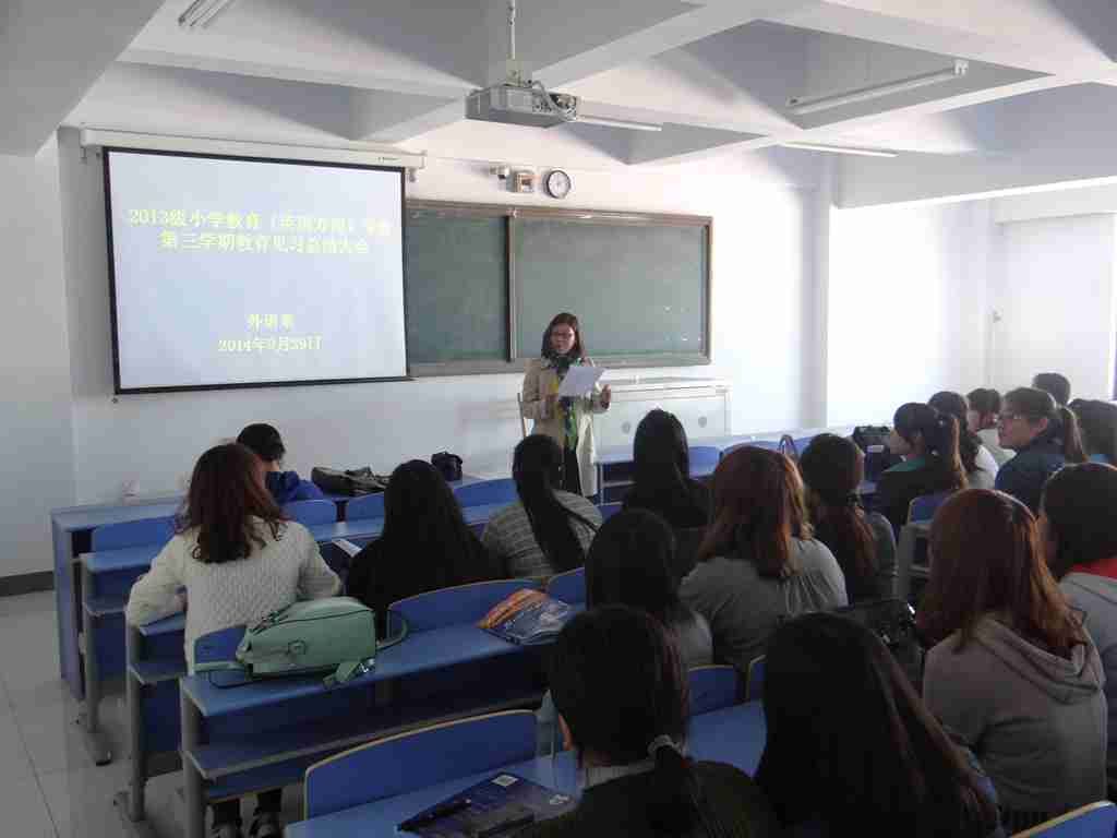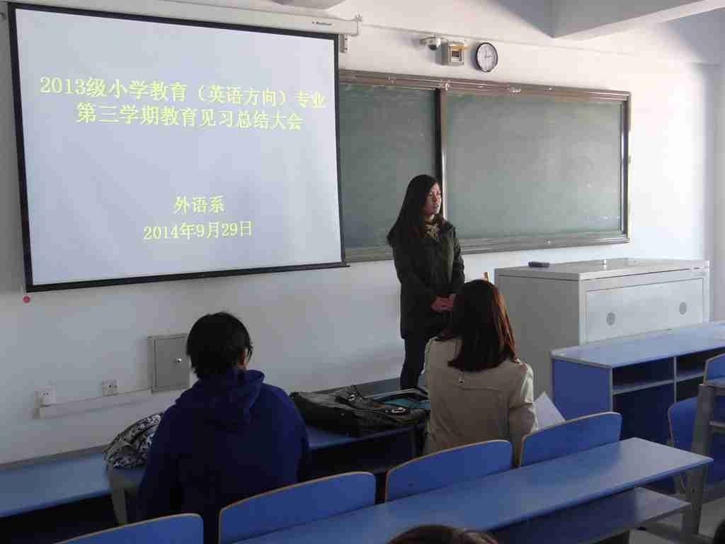 外语系于2014年9月29日中午12时在外语系602教室进行了外语系2013级小学教育(英语方向)专业第三学期教育见习总结会。首先,由2013级小学教育(英语方向)专业一班同学木其尔及2013级小学教育(英语方向)专业二班同学周雪代表见习生发言,总结其在小学所见所闻。其后,由外语系英语教研室负责人红霞对见习工作进行了全面总结,并对见习生寄言,希望他们在以后的专业学习上继续努力,为将来走上教师岗位做好充分的准备。