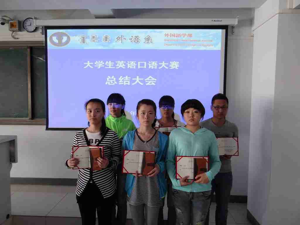为提升同学们英语口语表达能力,进一步培养同学们学习英语的兴趣,外语系团总支、英语教研室听说课程组于2014年4月25日晚7:30在新教学楼618教室举办了大学生英语口语比赛。外语系萨仁格日乐、王牧兰、春梅及两名外教担任了本次比赛的评委。