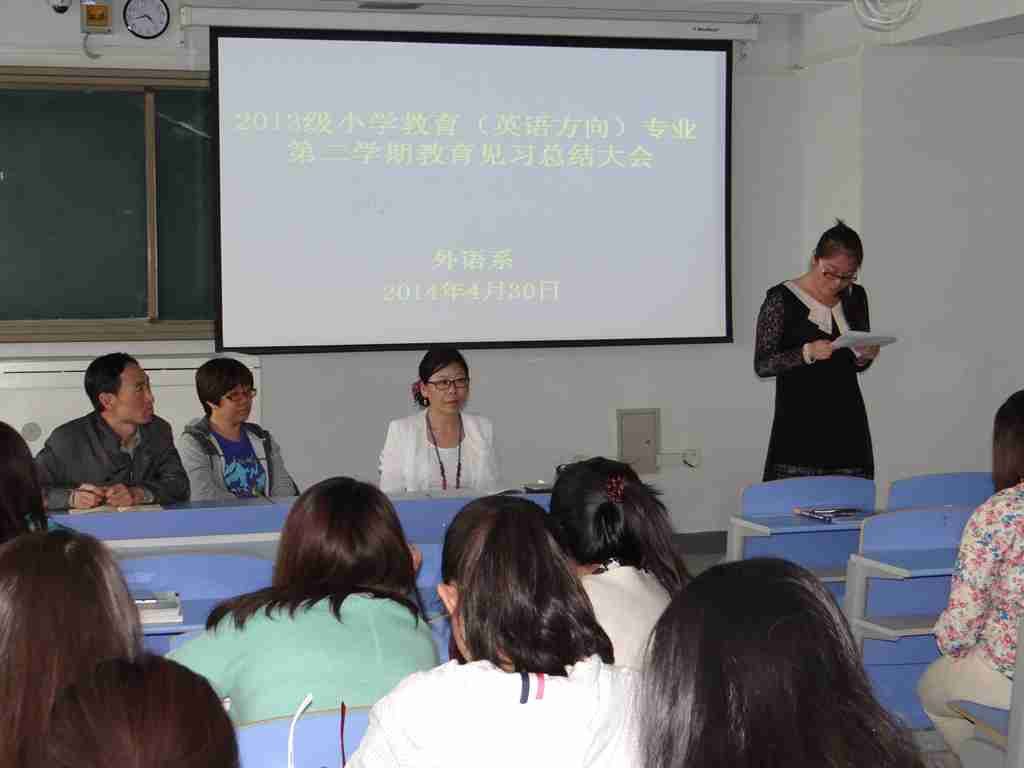 外语系于2014年4月30日下午4:40时在外语系618教室进行了外语系2013级小学教育(英语方向)专业第二学期教育见习总结大会。大会由外语系英语教研室负责人红霞主持,并作见习总结。其后, 2013级小学教育(英语方向)专业一班的乌雅罕同学和2013级小学教育(英语方向)专业二班的于莹同学代表见习生发言。最后,系副主任苏日嘎拉图老师对见习工作进行了全面总结,并对见习生寄言,希望他们在以后的专业学习上继续努力,为将来做一名合格的小学英语教师做好充分的准备。