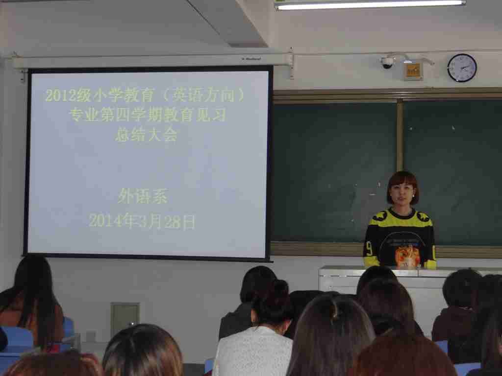 外语系于2014年3月28日下午4:00时在外语系604教室进行了外语系2012级小学教育(英语方向)专业第四学期教育见习总结大会。大会由外语系英语教研室负责人红霞主持,并作见习总结。其后, 2012级小学教育(英语方向)专业一班哈布热同学及2012级小学教育(英语方向)专业二班白南丁同学代表见习生发言,汇报了见习心得与收获。最后,系主任肖查娜老师对见习工作进行了全面总结,并对见习生寄言,希望他们在今后的专业学习上继续努力,不断夯实职业技能,为下一步的专业实践做好充分的准备。