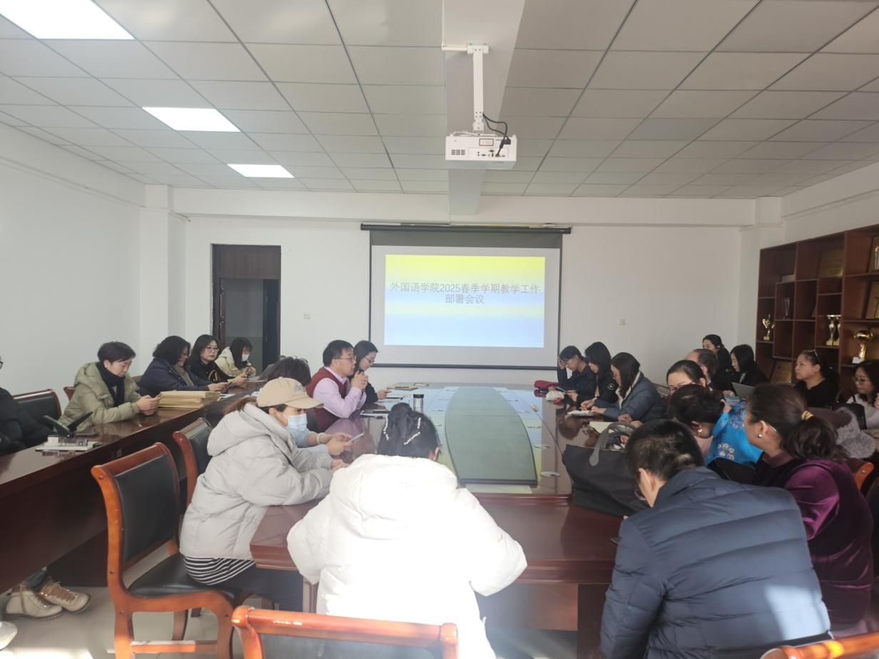 为全面贯彻落实学校教育教学工作精神,扎实推进新学期教学任务,外国语学院于2月25日召开了2025年春季学期教学工作部署会议。会议由秦红喜院长主持,全体教师参会。会议明确了新学期的教学重点工作任务和目标,为新学期的教学工作指明了方向。