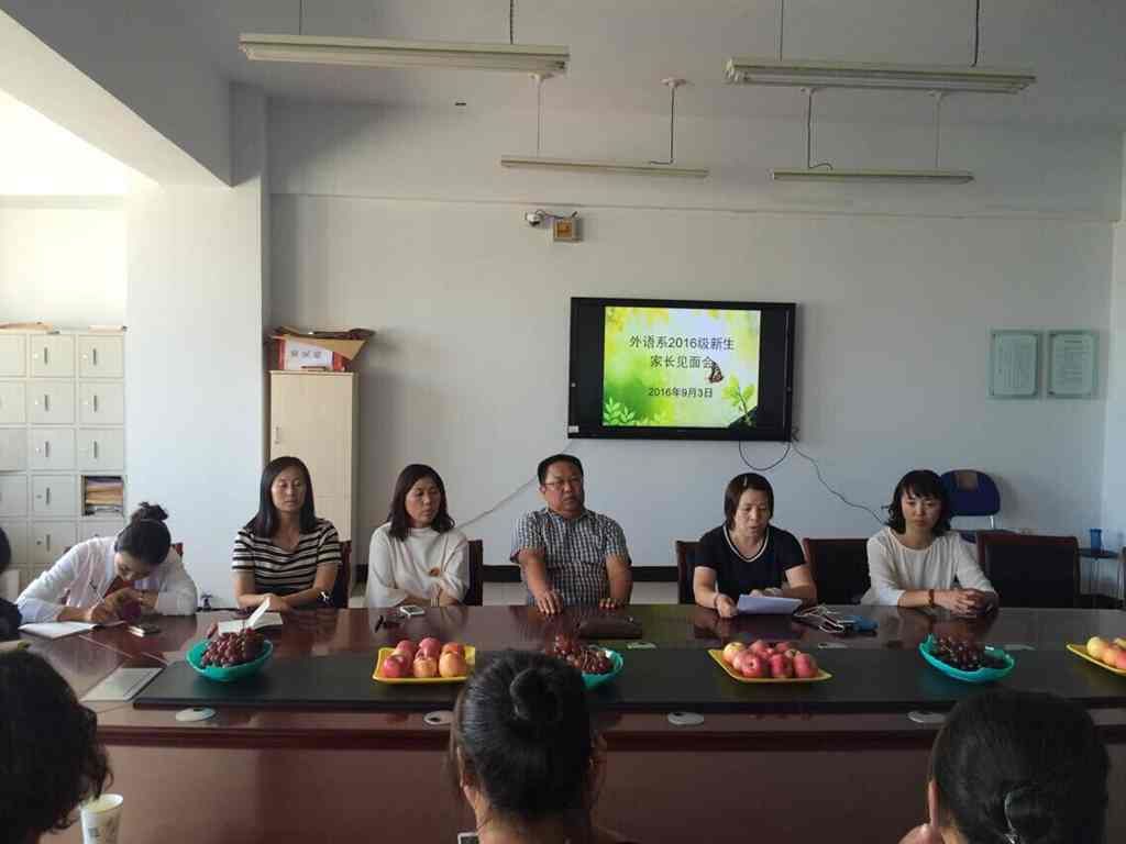 外语系2016级新生家长见面会于2016年9月4日下午在都林楼外语系会议室举行,外语系党总支书记布和朝鲁、系主任肖查娜、党总支副书记红梅、团总支负责人王春梅及16级各班班主任参加了此次会议,见面会由布和朝鲁书记主持。