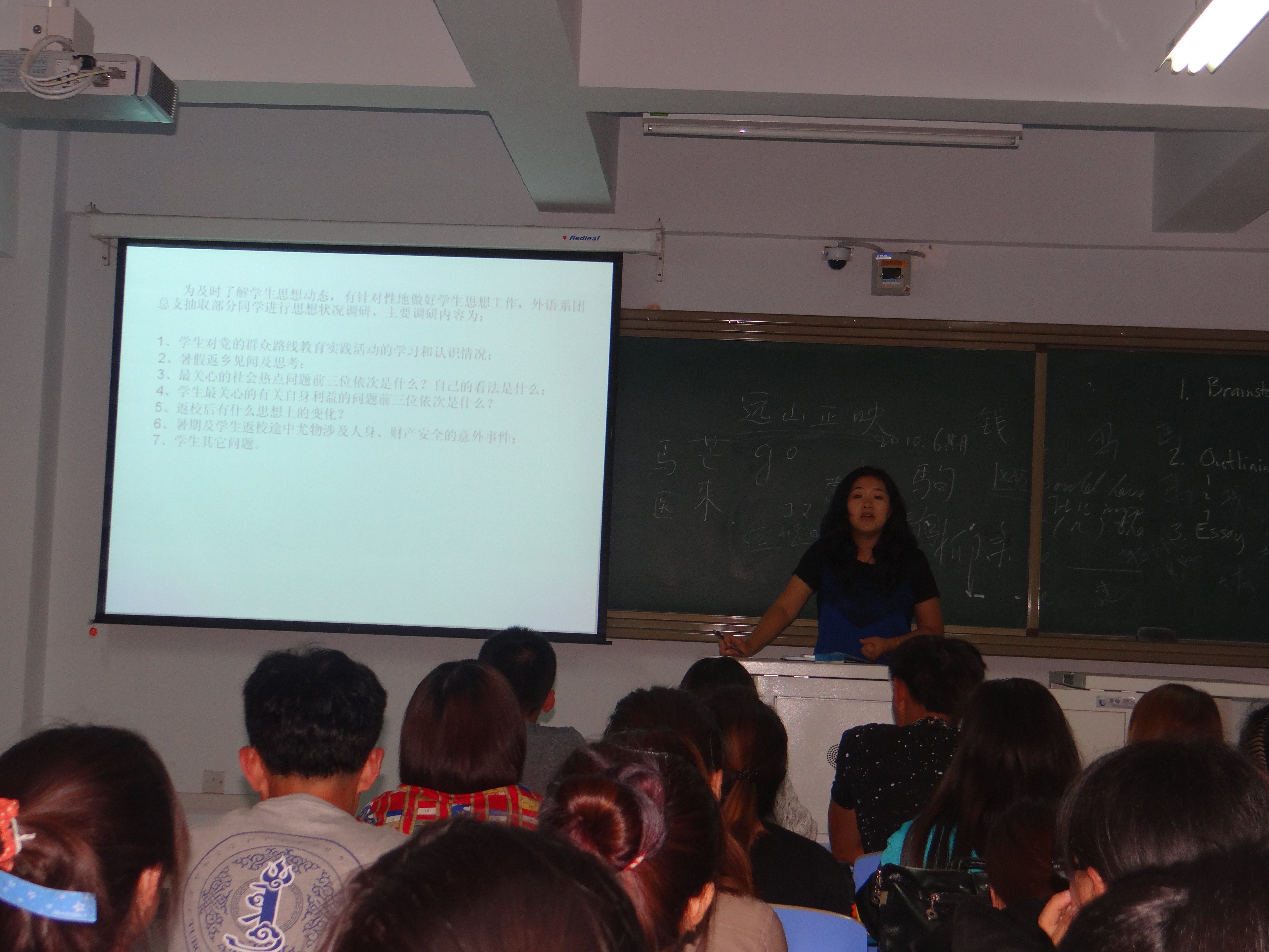 为及时了解学生思想动态,有针对性地做好学生思想工作,外语系团总支于2013年8月28日晚7点在新教学楼602教室召集学生代表70人进行思想状况调研。