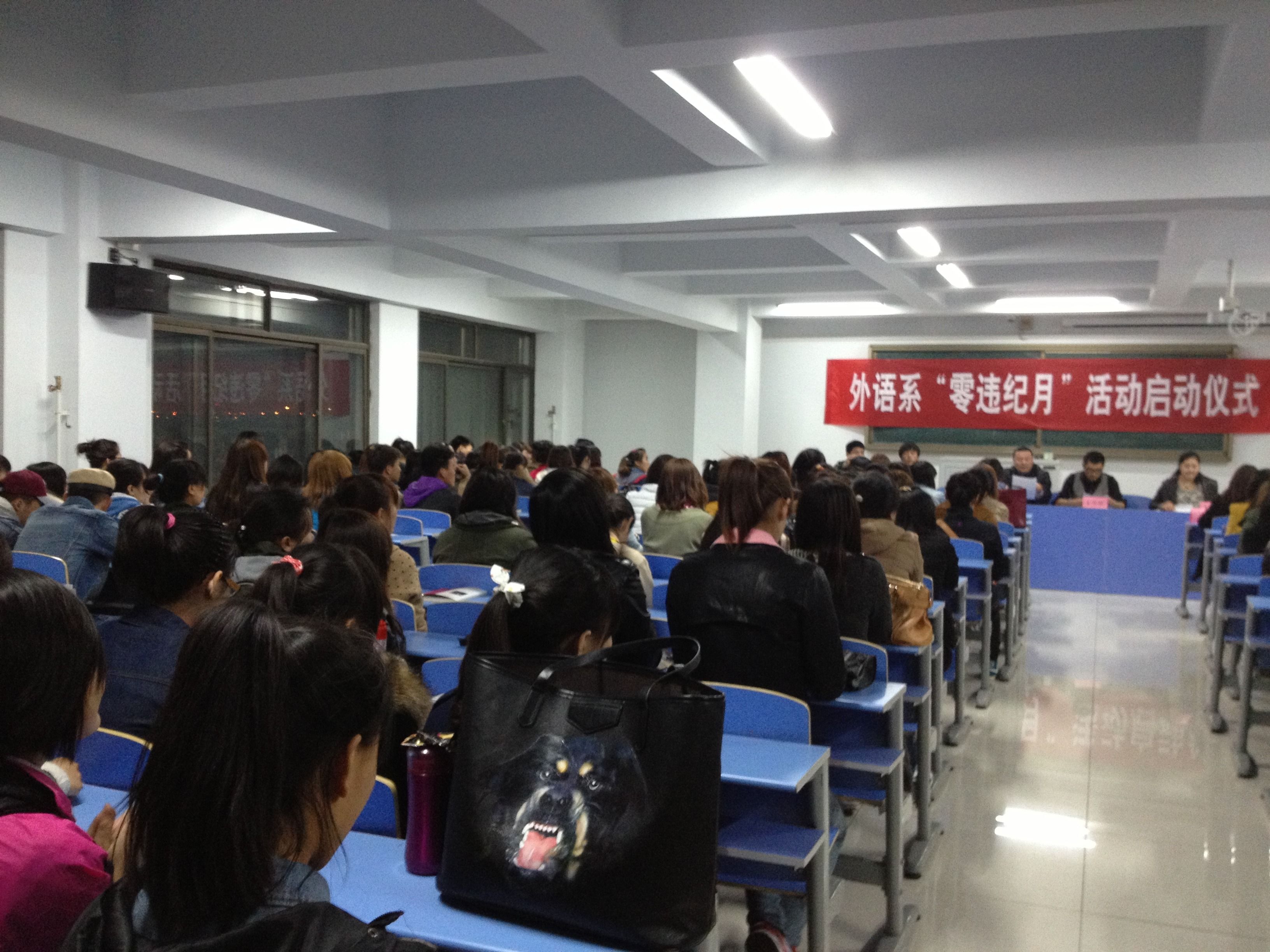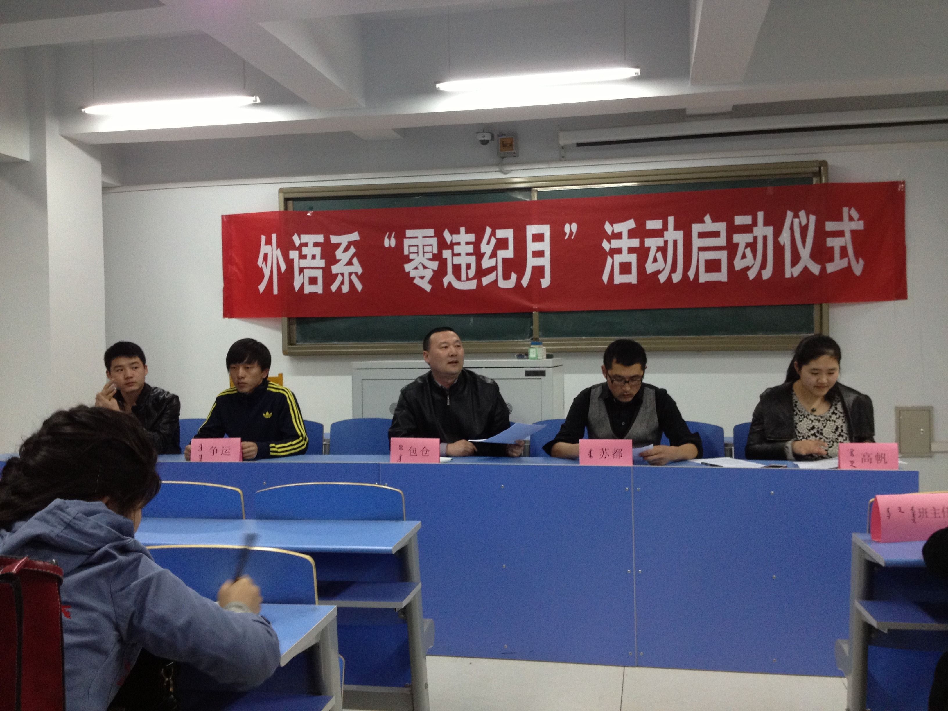 为配合学院开展好“零违纪月”活动,外语系团总支于2013年3月11日晚7点组织全系学生、各班班主任召开会议,正式启动了外语系“零违纪月”活动。学生处副处长朝格吉乐图出席了启动仪式。
