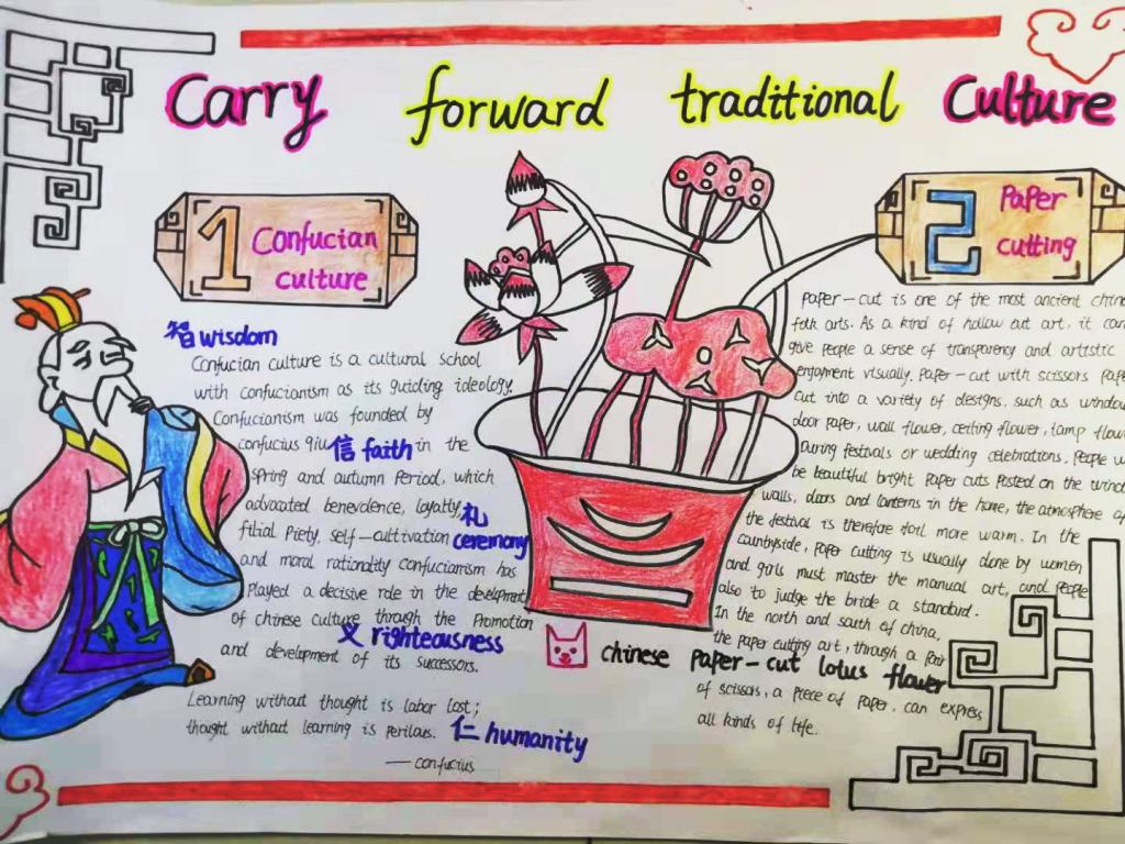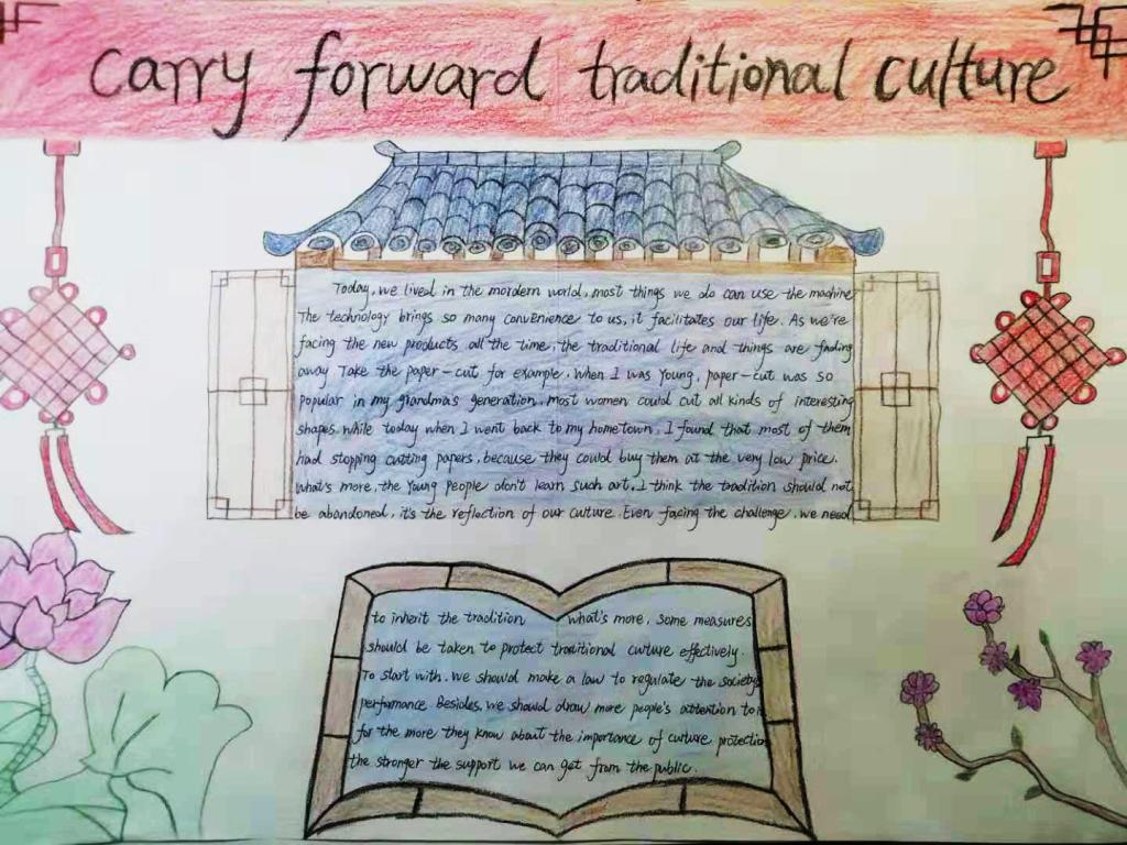 决赛以现场演讲方式进行。选手们充分发挥专业优势,用流畅标准的英语对自己的作品进行了详细讲解,并由评委老师根据评分标准为选手打分。为提高本次活动的参与性,决赛现场还安排了现场投票环节,由30名现场观众通过投票小程序为参赛者进行现场投票,最终根据评委打分及观众投票决出了比赛名次。本次活动旨在通过手抄报的方式,启发与鼓励大学生以正确的态度继承和弘扬传统文化。活动的成功举办,对于大学生自身的全面健康发展和与他人、社会的和谐发展具有十分重要的现实意义,使选手及观众深刻领会了中华优秀传统文化的内涵,认识到中华传统文化的重要性,激发了大学生民族责任感。