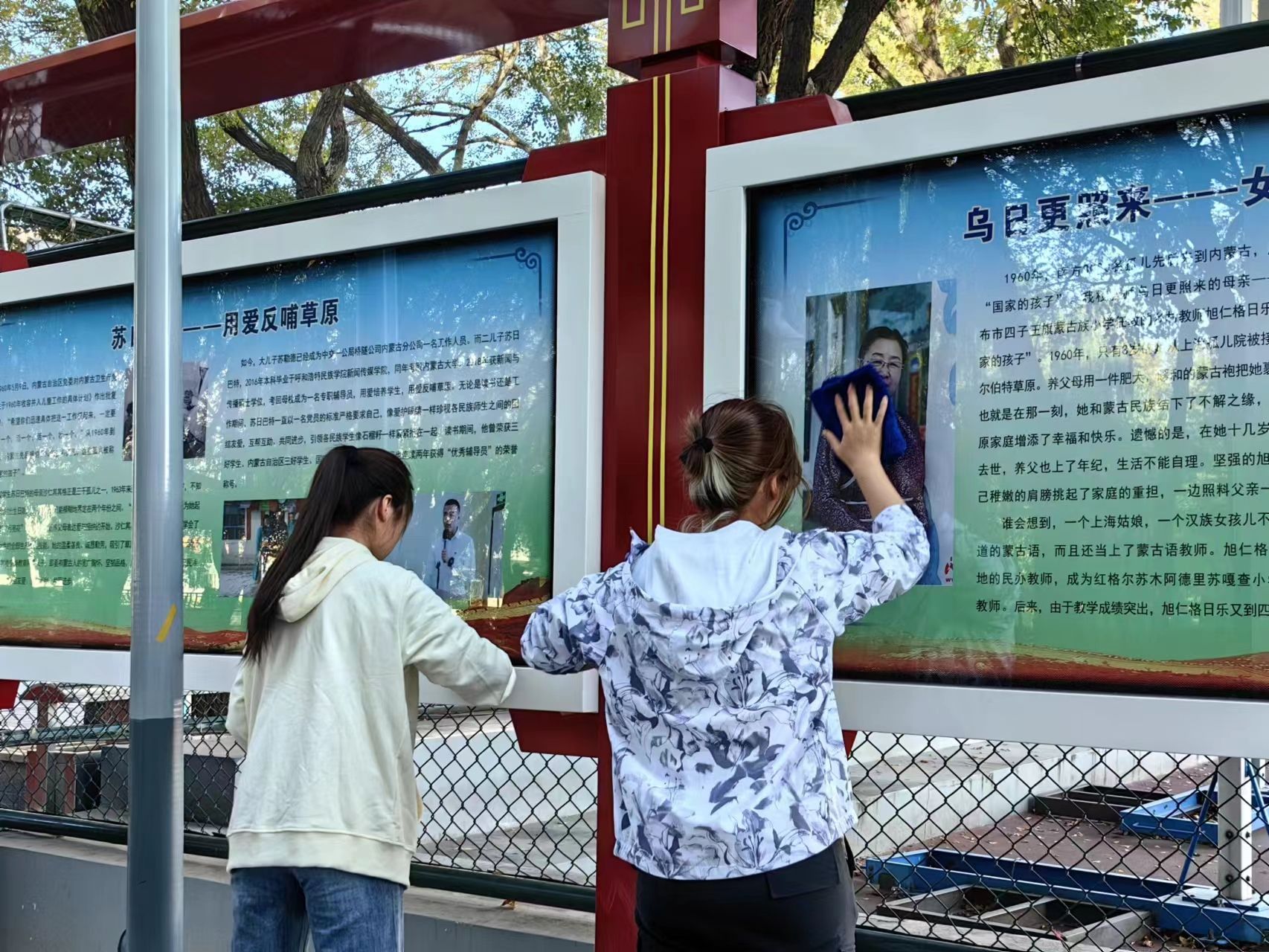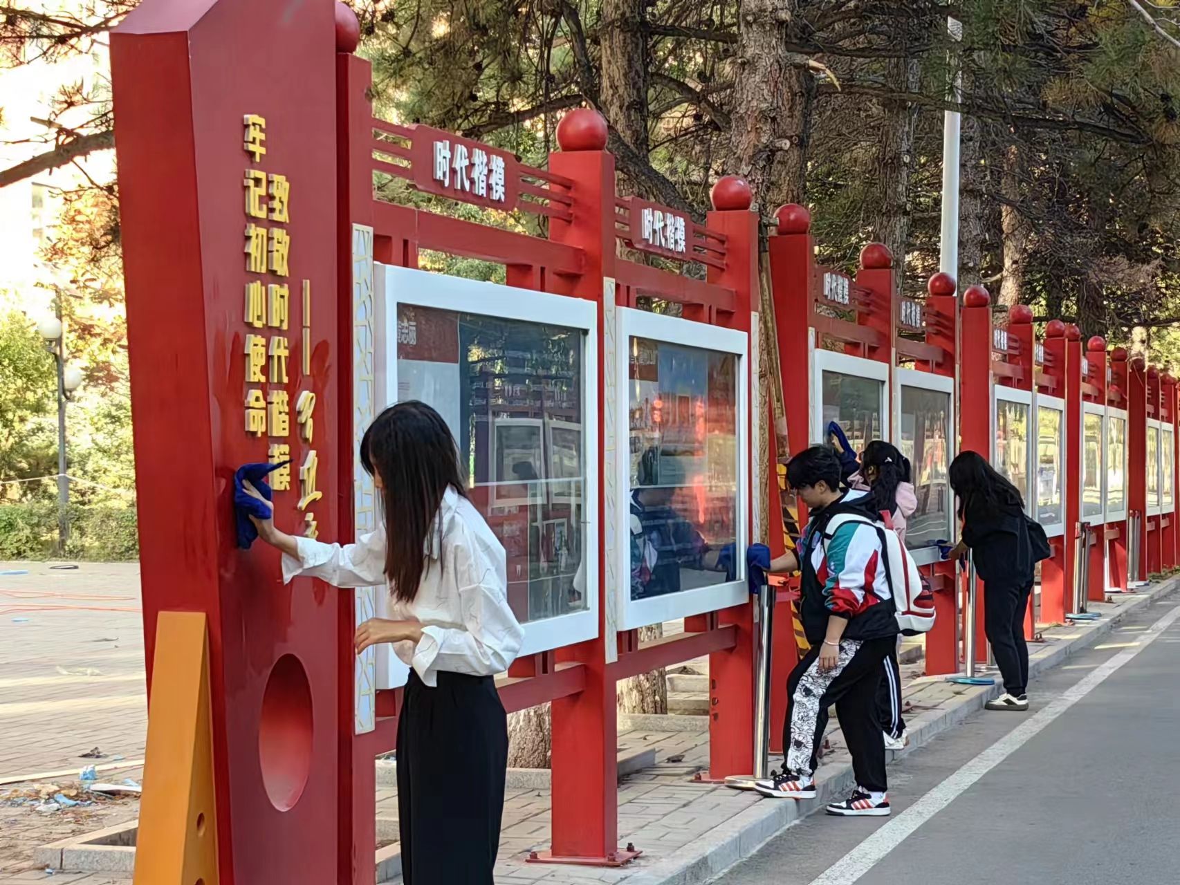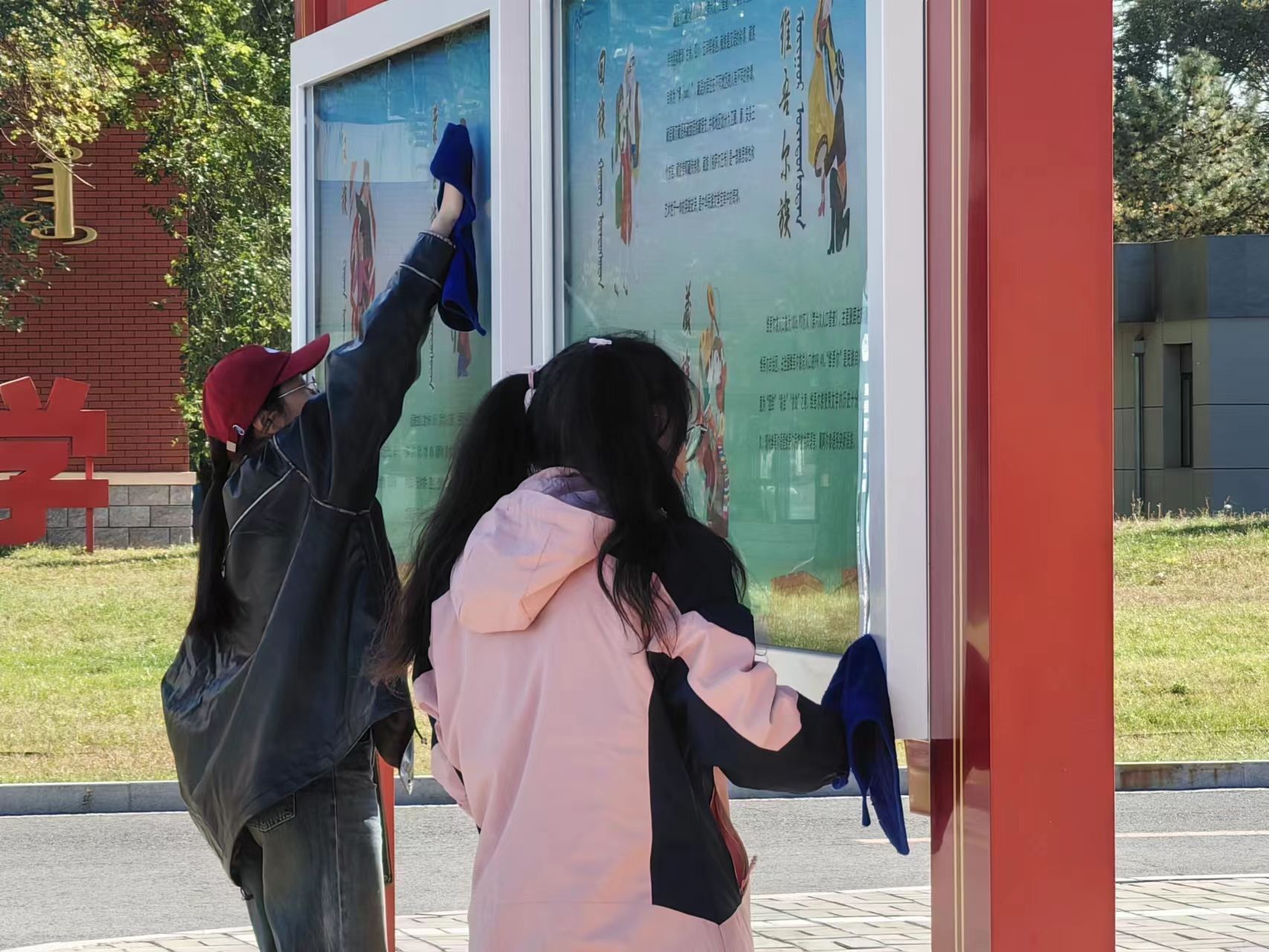 活动中,学生志愿者分成七个小组,在活动负责人的带领下,大家井然有序的开始校园清洁活动。大家各执清洁工具,相互协作,对鸭脖“时代楷模文化长廊”“民族团结进步文化长廊”进行集中清洁,堆积的尘土被一点点擦净,展示牌一点点变得明亮。整个活动过程中,大家发挥个人积极性,共同努力,饱含热情地完成这次任务。