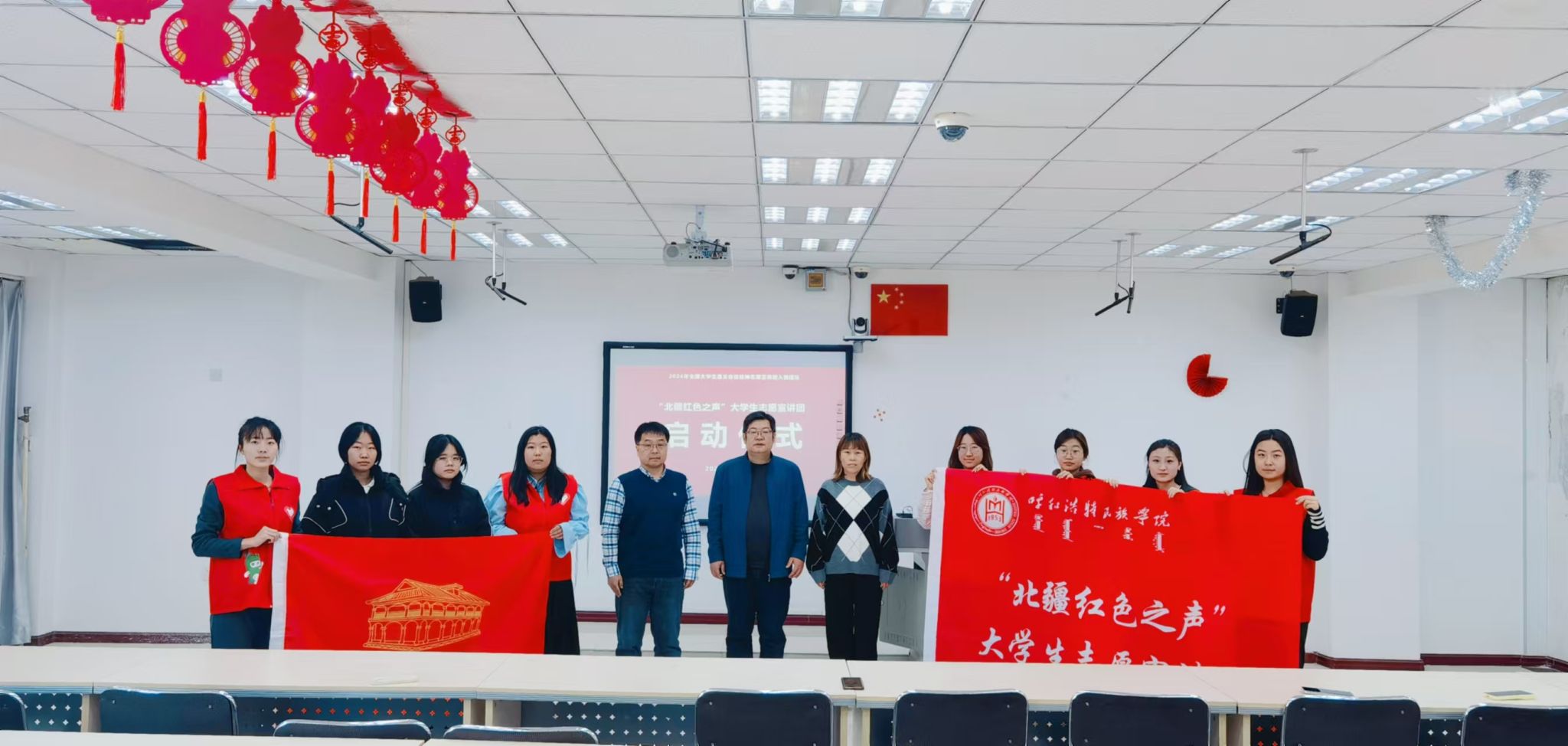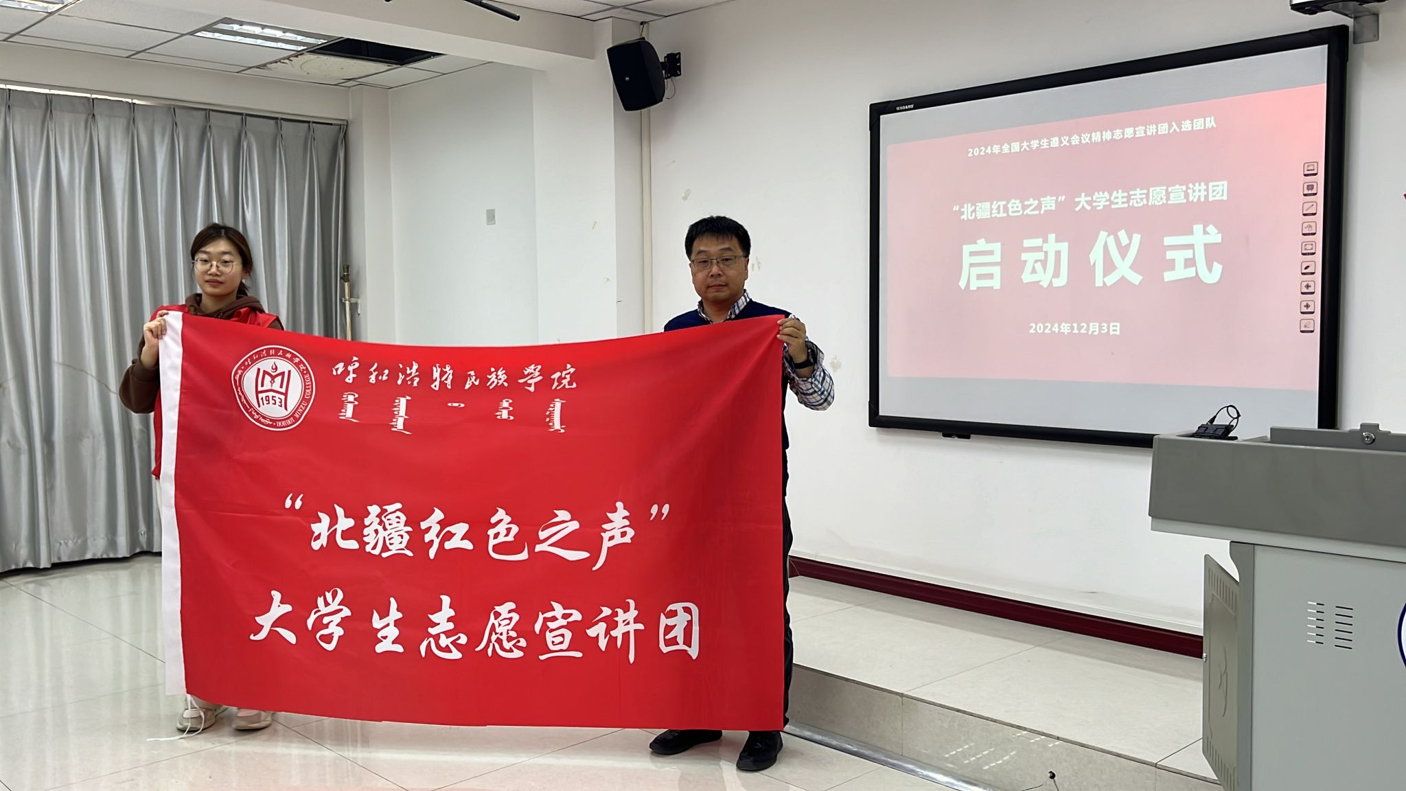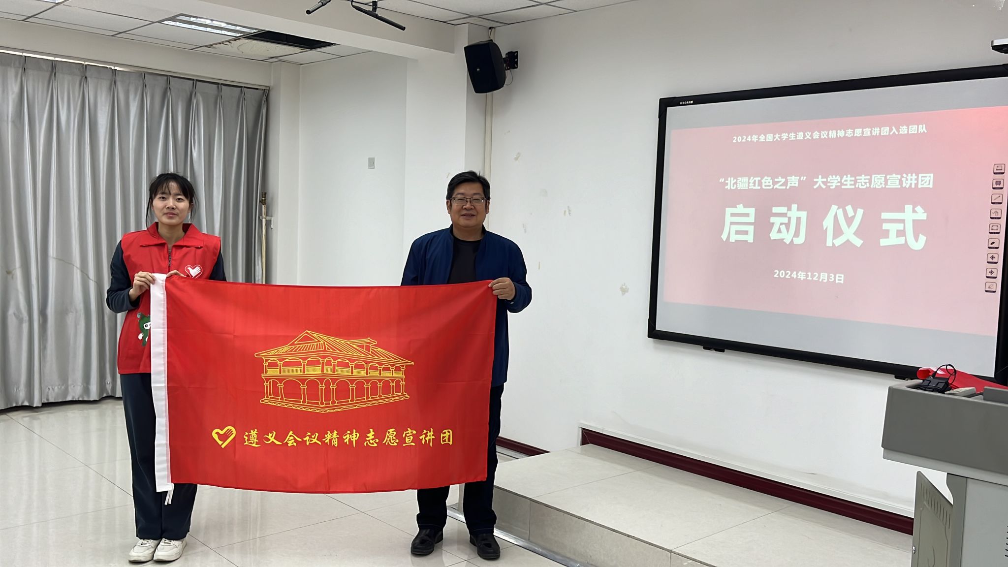 启动仪式上,首先由指导教师介绍宣讲团情况,并由宣讲团团长黄卫秀同学宣读《“北疆红色之声”大学生志愿宣讲团宣讲活动方案》。随后,朱俊杰书记向宣讲团授“遵义会议精神志愿宣讲团”团旗。朱书记向在座的宣讲团成员表示衷心的祝贺,希望各位同学在接下来的宣讲过程中要把握机会,精心准备,通过开展宣讲锻炼新本领,再创新佳绩。秦红喜院长向宣讲团授“北疆红色之声”大学生志愿宣讲团团旗,并对宣讲团的同学们提出了殷切的期望与明确的要求,他希望各位同学要注重提升沟通和表达能力,结合专业特色丰富宣讲形式,推进形成宣讲的广泛化、特色化。