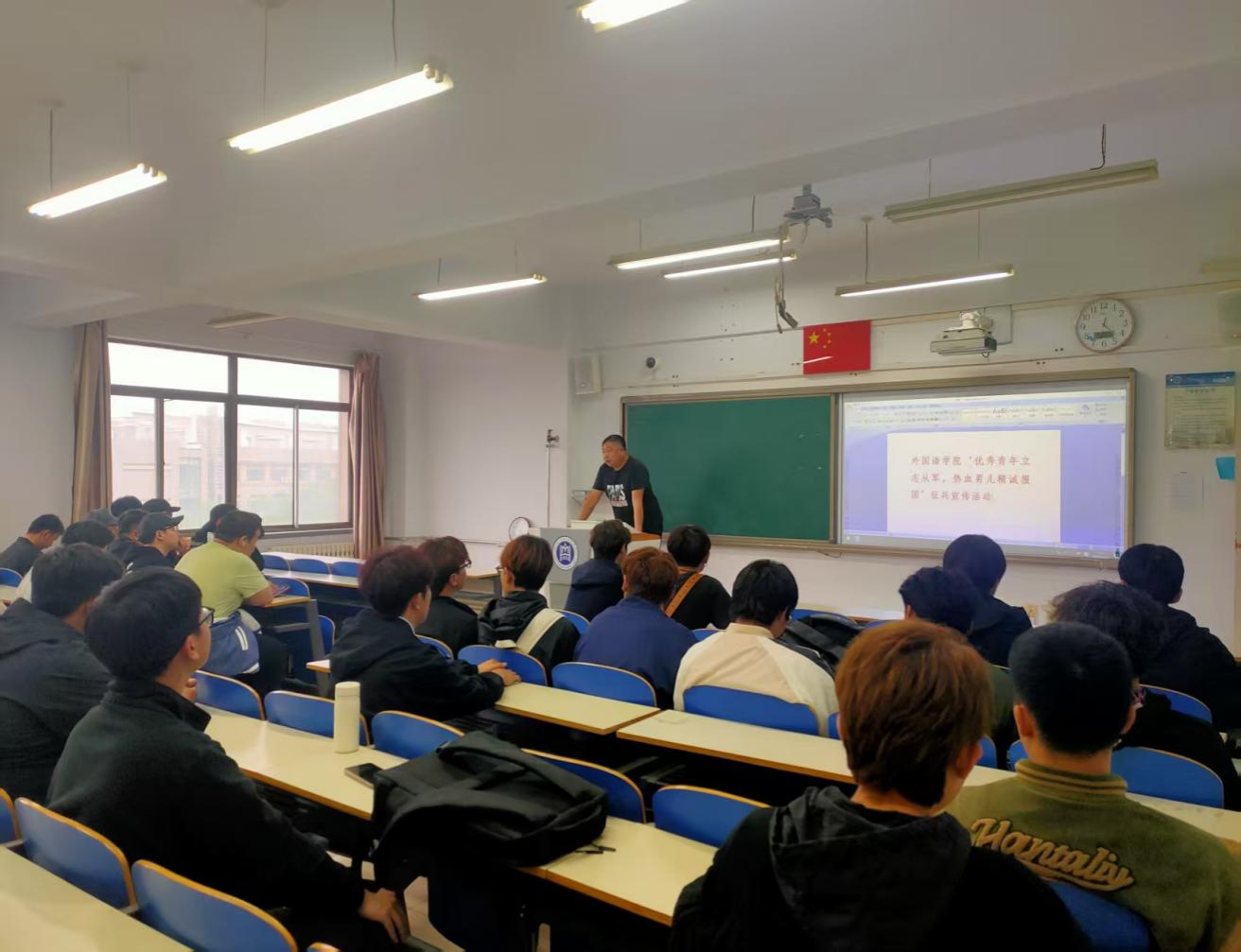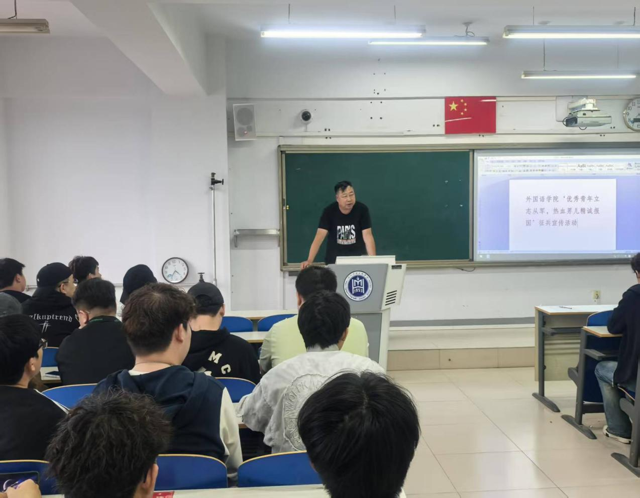 近日,为响应国家征兵号召,激发青年学生的爱国热情与从军志向,外国语学院举办了以“优秀青年立志从军,热血男儿精诚报国”为主题的征兵宣传活动。此次活动旨在向广大同学宣传国防知识,解答征兵政策,鼓励更多优秀学子投身军营,为国防事业贡献自己的力量。