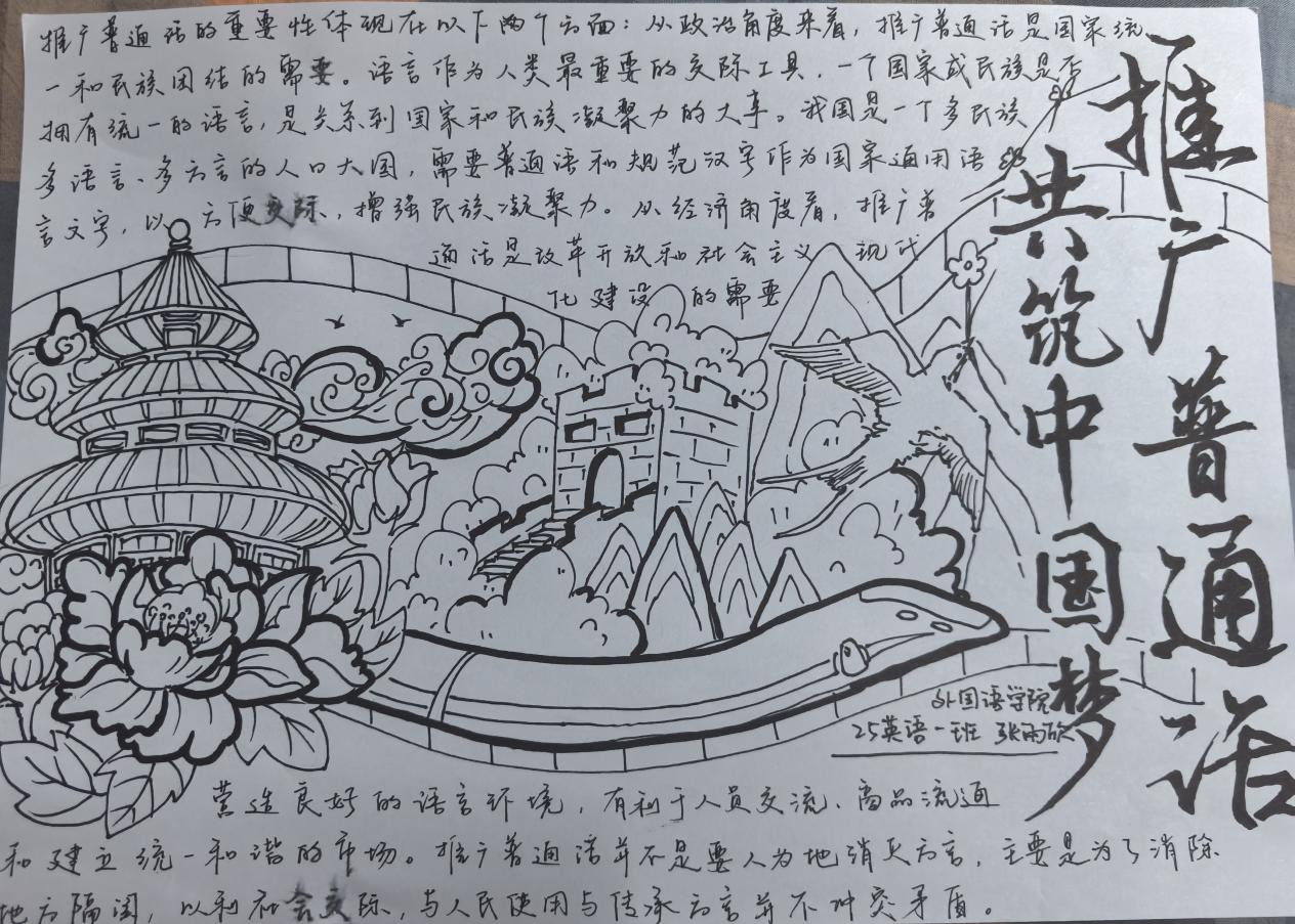 此次主题手抄报活动,不仅是一次文化实践,更是一堂生动的爱国主义教育课。通过亲手创作,同学们深刻感受到了中华民族浓郁的文化气息,激发了学生们的民族自豪感和爱国主义情怀;体会到普通话作为国家通用语言文字,是传承中华优秀传统文化、增进民族凝聚力、推动社会进步的重要工具。