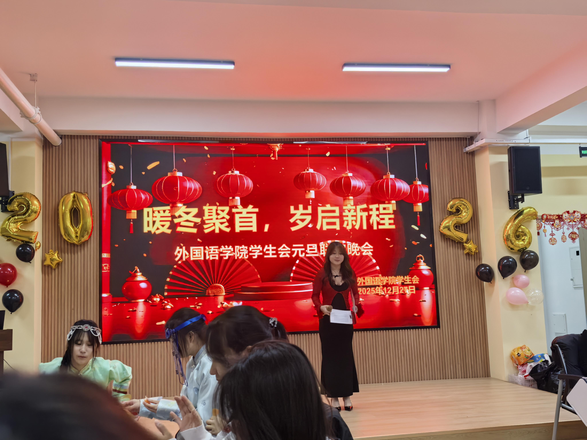 12月27日晚,外国语学院学生会全体成员在青春驿站举办了“暖冬聚首,岁启新程”元旦联欢晚会活动。本次活动特别邀请学院老师与学生欢聚一堂,共迎新年。