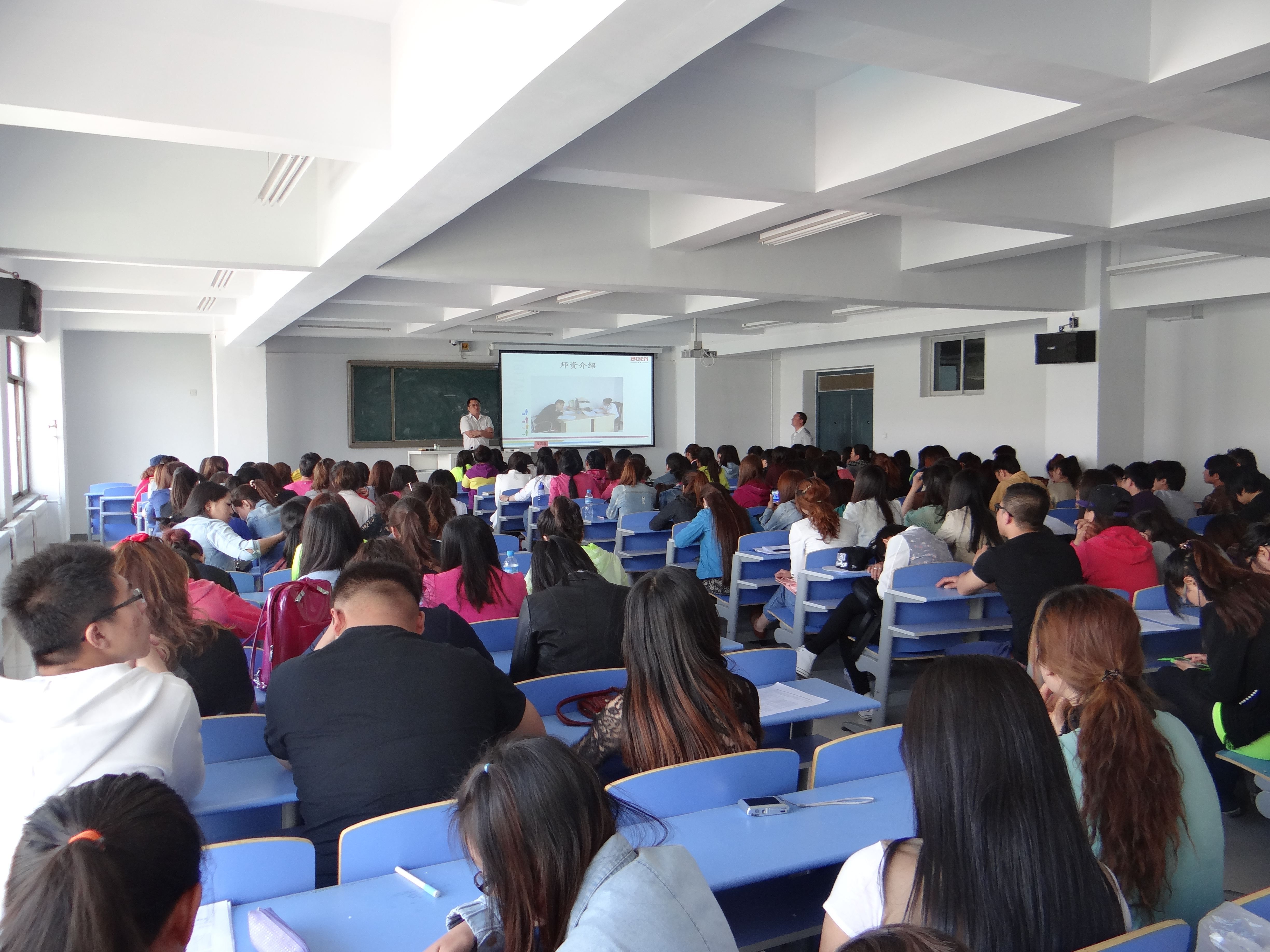洽谈会上,用人单位呼市回民区博恩英语培训学校杨校长向在座的毕业生介绍了学校的基本情况,为我系毕业生提供了包括专职、兼职的英语、奥数任课教师,兼职英语、数学助教等多个工种,20个岗位,并提供社会保险、住宿、旅游、寒暑假等福利。随后,部分毕业生向工作人员进行了简单的自我介绍,并与工作人员进行了互动交流,整个洽谈会进行得十分顺利。