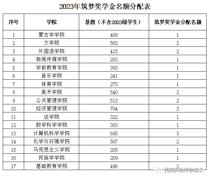 2023年筑梦奖学金名额:27名,奖学金金额每人4000元。请各学院按照《2023年筑梦奖学名额分配表》(附1)执行。