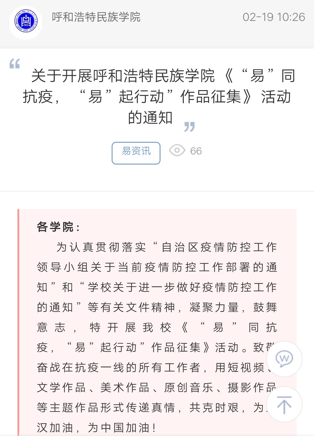 下一条:【重磅】疫情当前,呼民院学子志愿者展现青春使命 (一)