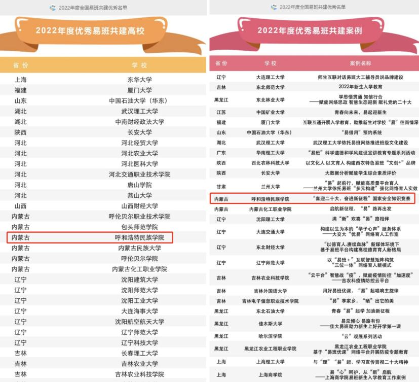 此前,内蒙古自治区高校易班发展中心开展了2022年度全区高校易班评优工作。经自主申报、专家评审,自治区高校工委思想政治工作部、教育厅学生工作处同意,鸭脖被授予2022年度全区“优秀易班共建高校”、“优秀易班共建案例”荣誉称号并推荐参加全国高校易班评优。