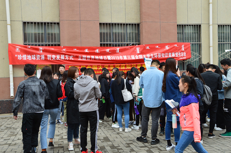 为宣传环保知识,提高大学生环境保护意识,引导师生用实际行动参与保护环境,4月25日上午,环境工程系环保协会、学生党支部组织开展了“珍惜地球资源 转变发展方式”的主题世界地球日——暨2019年第三届全国大学生环保知识竞赛宣传活动。