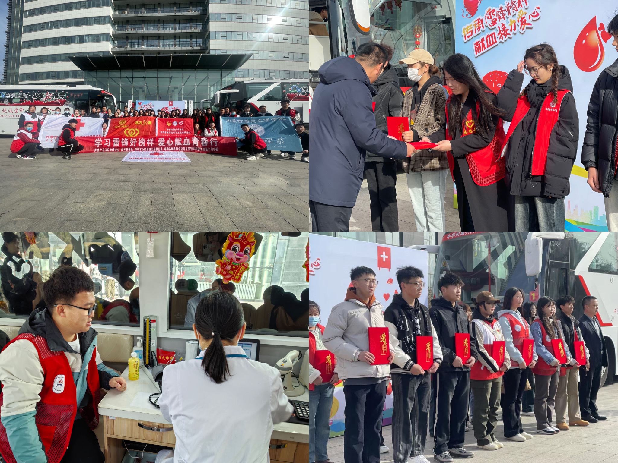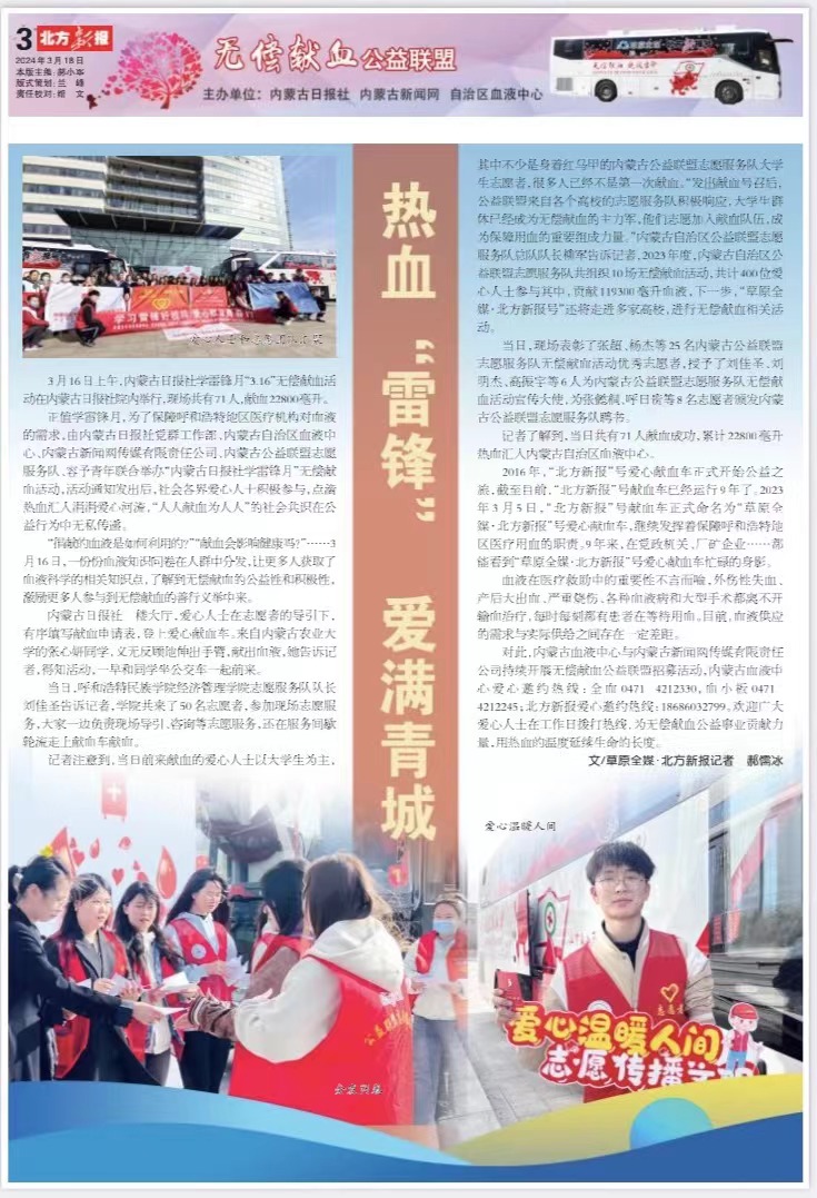 为进一步传承和发扬雷锋精神,3月16日,由内蒙古自治区血液中心、内蒙古日报社、北方新报社、内蒙古公益联盟志愿服务队主办,经济管理学院青年志愿者服务队协办的“热血‘倾城’,爱满青城”主题学雷锋活动于内蒙古日报社举办,参加本次活动的各界献血者共71人,累计献血22800毫升,经济管理学院出动志愿者50余人。