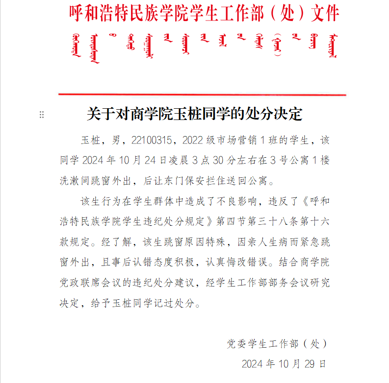 关于对商学院玉桩同学的处分决定
