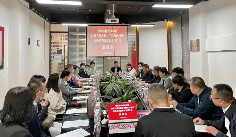 招聘会前,校领导一行与内蒙古启铭鑫人才科技发展有限公司、内蒙古正大有限公司等11家用人单位招聘负责同志进行座谈。会上,格日乐图书记代表学校对用人单位给予本次活动的支持表示感谢,并介绍了学校人才培养和专业建设等总体情况。他谈到,让就业创业工作做到更有温度、更有力度,更有深度一直是学校努力的方向,直播带岗着力畅通企业和毕业生沟通交流渠道,打破线上双选会单一的组织形式,让毕业生获得了对用人单位情况、岗位要求更深入的了解机会。他表示,学校一直以来高度重视毕业生就业工作,积极为毕业生和用人单位搭建有效的供需平台,此次调研和举办专场直播带岗招聘会,更是以实际行动落实书记校长访企拓岗促就业专项行动的具体表现。他希望,学校与用人单位要不断拓展合作领域范围,探索人力资源共享新模式,积极为毕业生和企业搭建互通平台,全力推动毕业生就业创业工作,努力开创校企地融合发展、合作共赢的新局面。