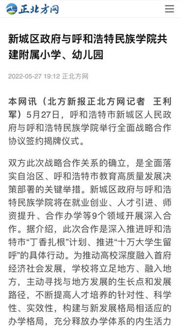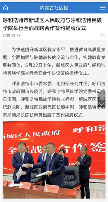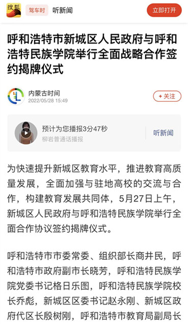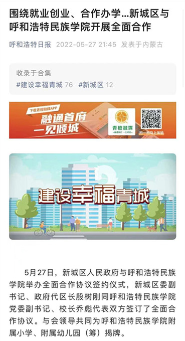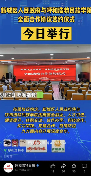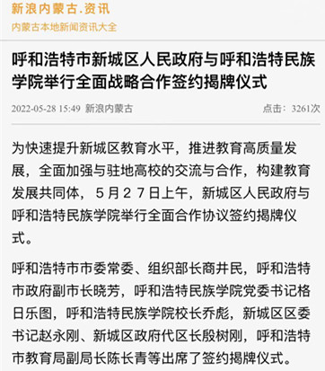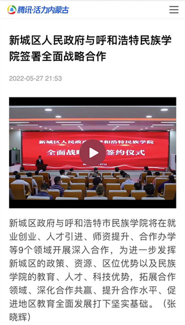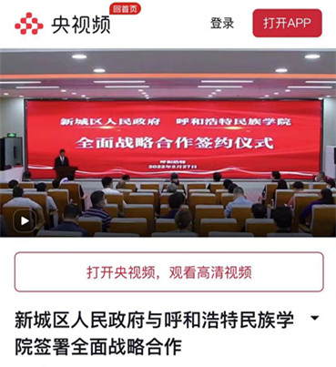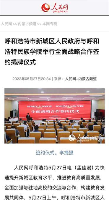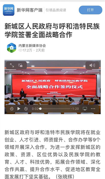 多家媒体广泛报道鸭脖与新城区人民政府签署全面战略合作框架协议 2022-06-01 党政办公室 学校官网 5月27日上午,新城区人民政府与鸭脖签署全面战略合作框架协议。人民网、新华网、草原客户端、内蒙古新闻网、呼和浩特日报等主流媒体进行了跟踪报道。新浪新闻、腾讯新闻、搜狐新闻等多家媒体进行了转载报道。媒体的广泛关注,进一步扩大了鸭脖的知名度、美誉度。 人民网 新华网 央视频 内蒙古综合新闻网 草原客户端 正北方网 北方新报 内蒙古社区报 蒙马财经 呼和浩特日报 呼和浩特日报视频号 青橙融媒 新浪网 搜狐网 腾讯网 打印 收藏