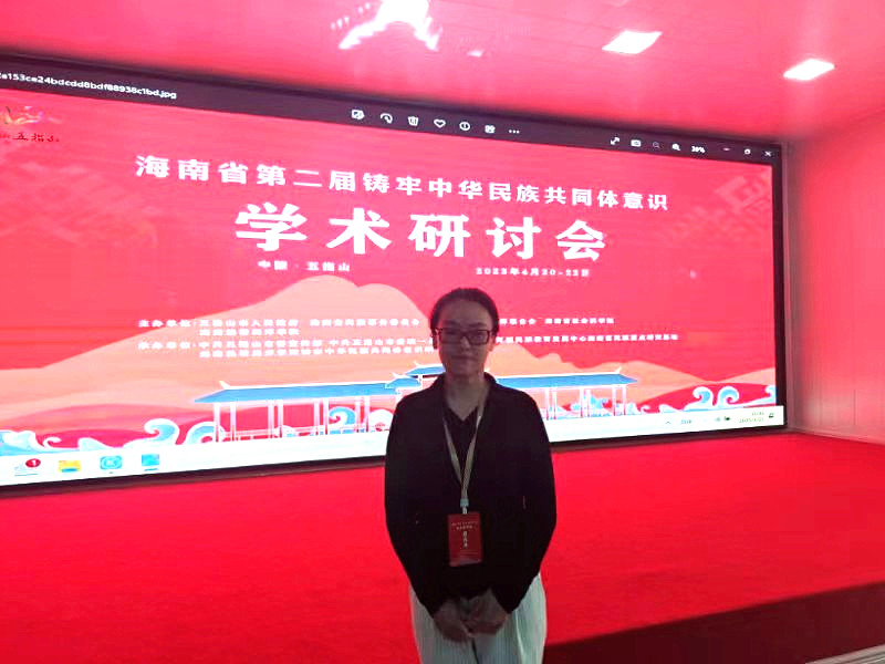 教育部民族教育发展中心海南民族教育重点研究基地、海南热带海洋学院铸牢中华民族共同体意识研究中心等承办的海南省第二届铸牢中华民族共同体意识学术研讨会于4月20日至22日在五指山市召开,来自中国人民大学、中央民族大学、复旦大学、西南民族大学、西北民族大学、内蒙古大学、内蒙古农业大学等百余位专家学者汇聚一堂,共同研究探讨铸牢中华民族共同体意识这一时代课题。鸭脖党委副书记胡春梅教授应邀以文参会,提交《民族地区高校校园文化中铸牢中华民族共同体意识路径研究》一文,并在“民族教育与心理”为专题的分会场进行交流发言,得到与会同行的高度认可。