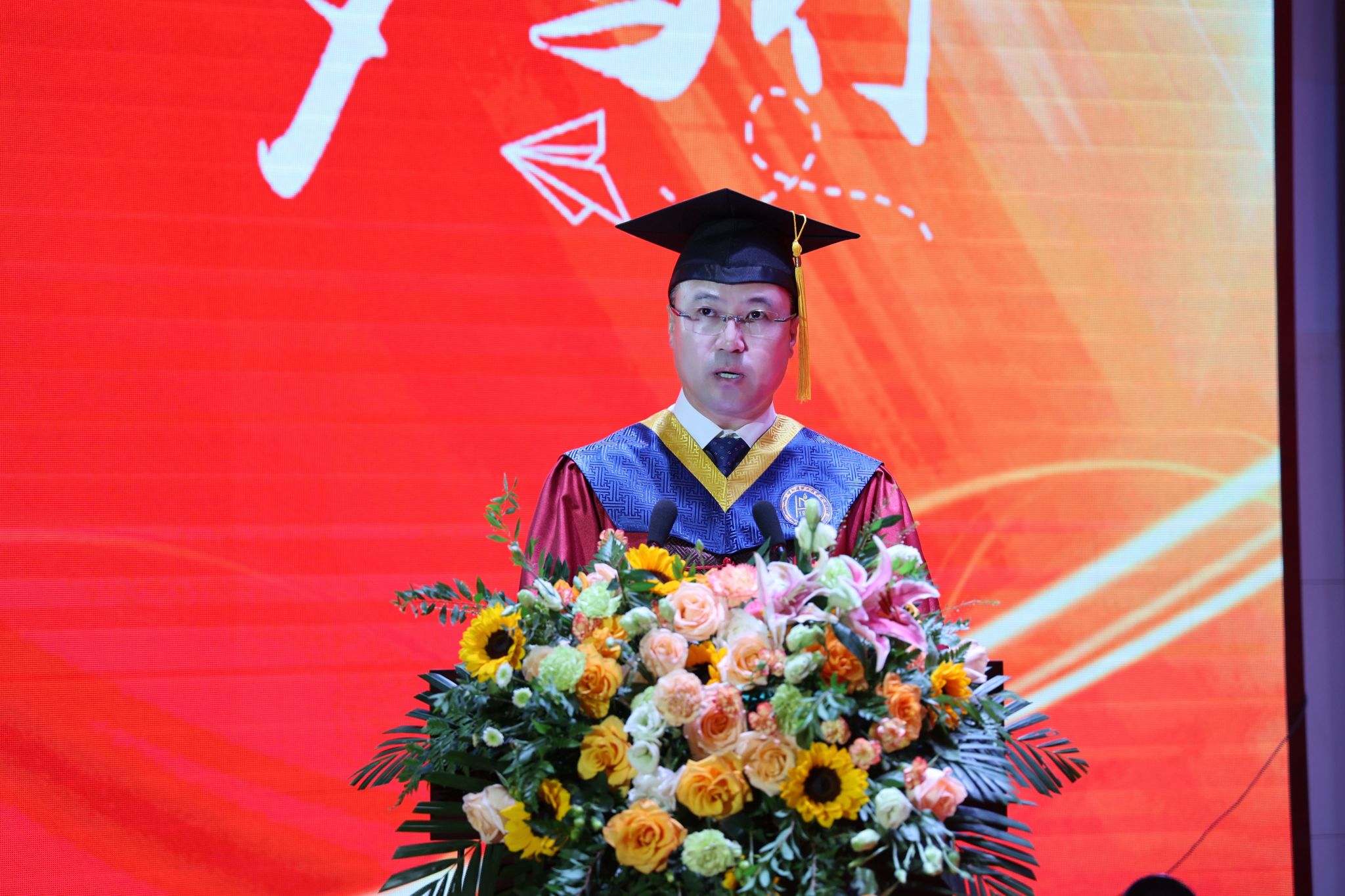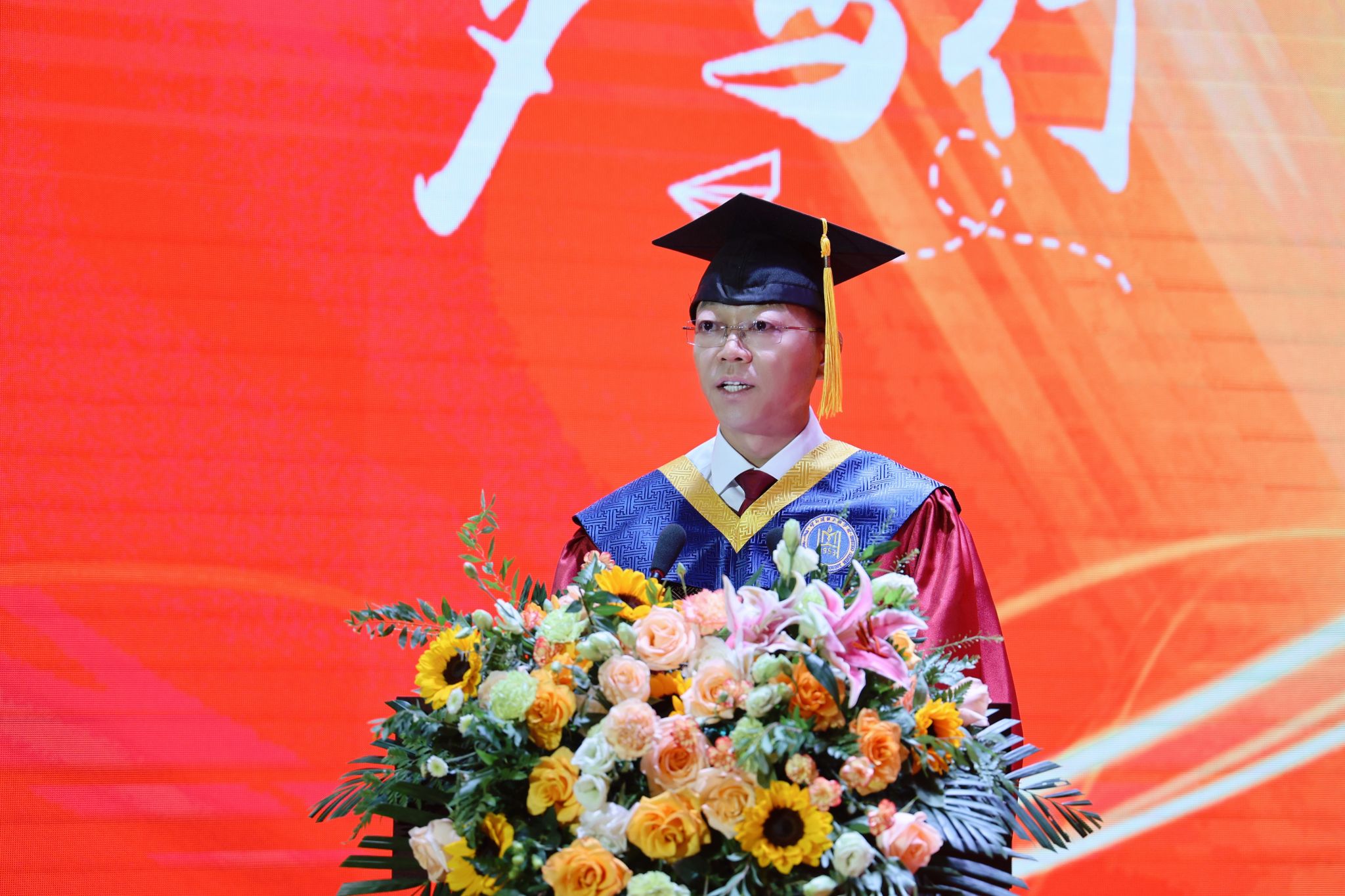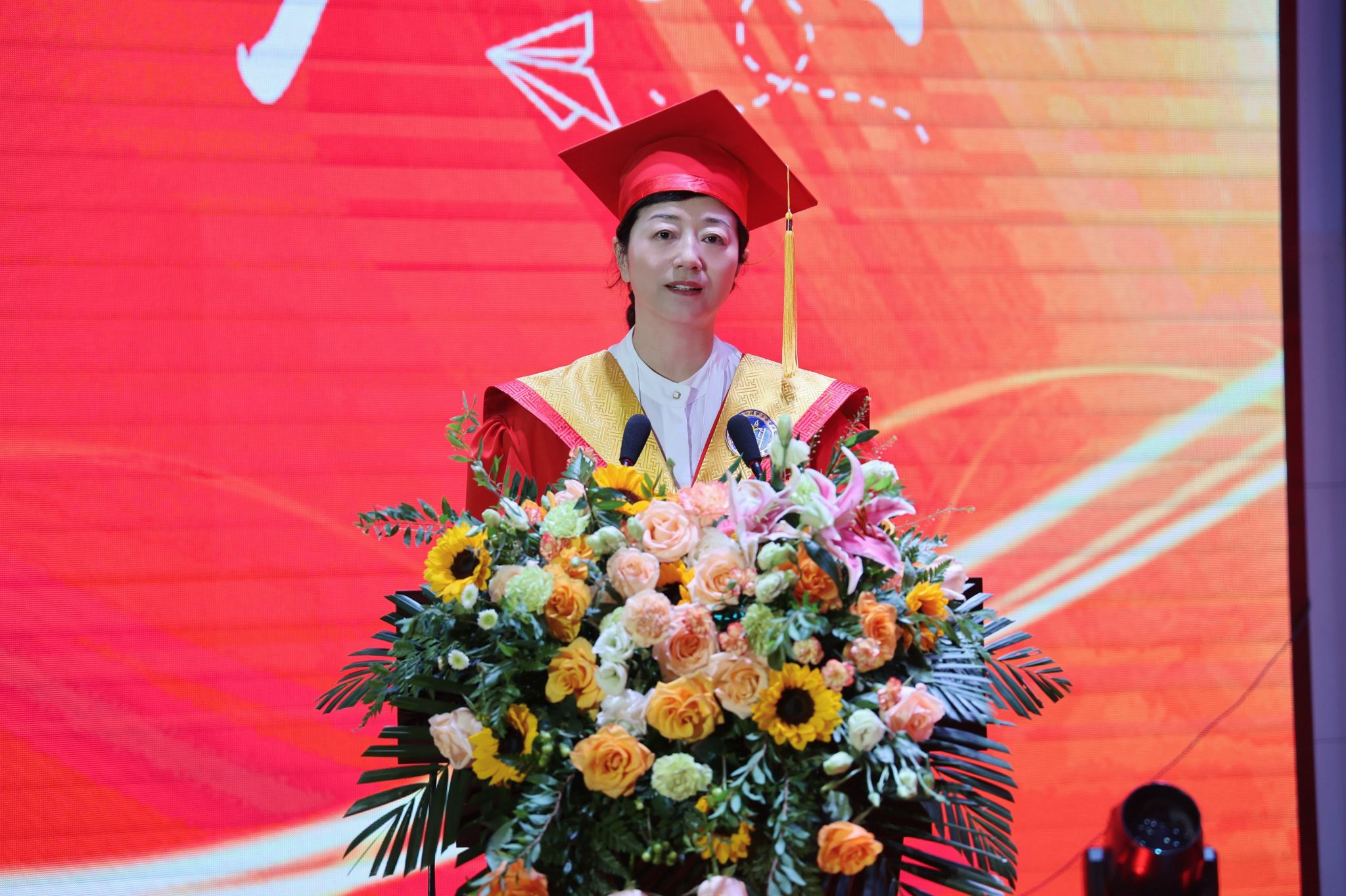 王敏校长在题为《奋楫启航向星辰大海 逐梦笃行谱青春华章》的毕业致辞中,回顾了即将毕业的民院学子们在校期间经历的建校70周年庆典和所见证的学校获批硕士学位授予单位的历程,并肯定学生在学术科研、比赛竞赛、社会实践方面取得的优异成绩,点赞学子们投身基层建设家乡,参军入伍保家卫国的时代担当。她希望毕业生们,要胸怀大局,做爱国奉献者,传承学校民族团结基因。要脚踏实地,从平凡事做起,践行 “靠得住、下得去、干得好”的品格。要勤学不辍,以终身学习适应时代,提升跨界能力。