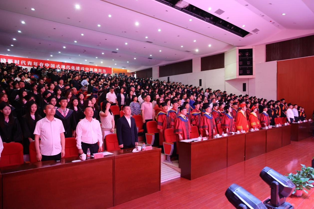 毕业典礼在庄严的国歌声中拉开了帷幕,全体师生高唱国歌,毕业典礼正式开始。