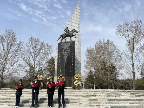 鲜花敬献英烈,哀思祭奠忠魂。全体师生在革命烈士纪念碑前庄严列队,敬献鲜花,鞠躬默哀,追思革命先烈的丰功伟绩,并向他们致以崇高的敬意。随后,4名学生代表进行了“缅怀革命先烈,传承红色基因”主题演讲,用真挚的语言表达了莘莘学子立志报国之心,拳拳爱国之情。党总支书记齐占柱带领全体党员重温入党誓词,铿锵有力的誓言回荡在烈士陵园的上空,也激荡在每个党员心中。