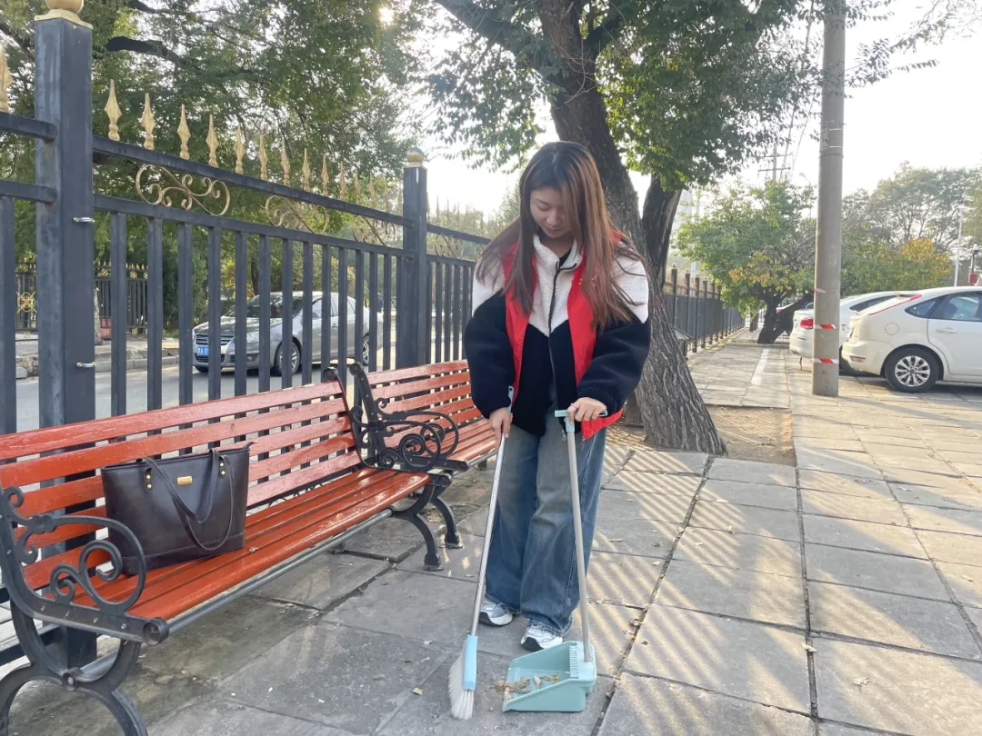 文化传承的使命在心底扎根,这份赤诚便化作俯身实践的热忱。红马甲的亮色,很快铺满了古院的角落,同学们整理展陈周边的环境——每一次弯腰,都是对文化遗产的珍视;每一处清扫,都是对“共同体家园”的呵护。
