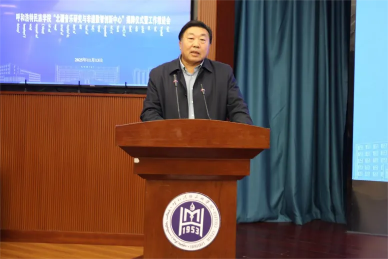 会议开始,音乐与舞蹈学院副院长韩木兰致辞,她对莅临现场的领导、专家、学者及同仁表示诚挚感谢,并围绕中心建设的背景、意义及学科支撑基础展开阐述,表达了学院推动北疆音乐与数智技术深度融合的决心。随后,学校科技处哈斯额尔德尼副处长从科研平台建设、资源整合与项目协作等方面,对中心未来发展提出期望与支持举措。