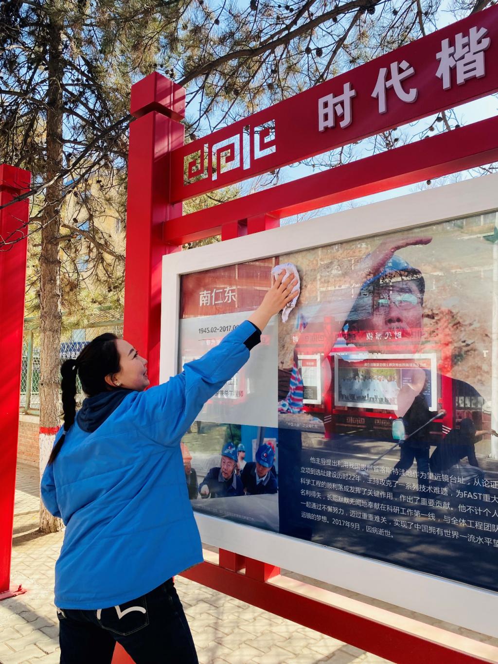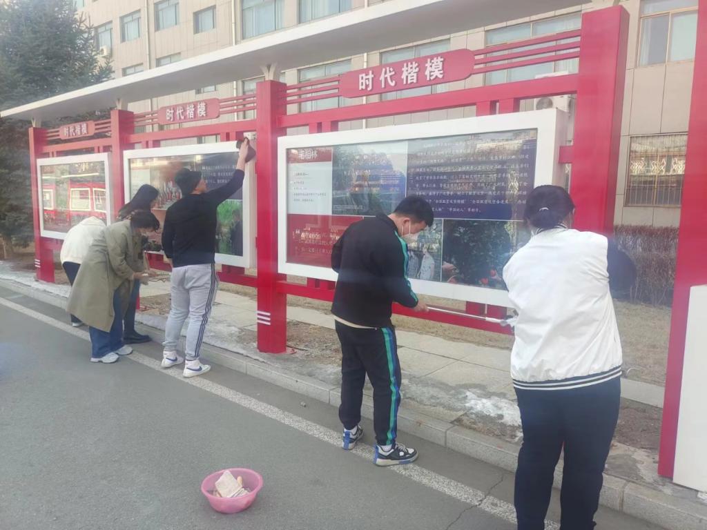 3月3日中午,学生党员陆续到达集合地点——时代楷模文化长廊党员先锋岗处。至12时30分,全体学生党员按时集合完毕。清点人数之后,学生党员们按次序站好,认真倾听党委组织部党员教育管理科科长齐丹老师对此次清洁活动和学习宣传时代楷模活动的安排。在各位党支部书记的带领下,学生党员们迅速投入到清洁劳动中。经过将近一个小时的奋战,宣传橱窗被打扫得一尘不染,焕然一新。