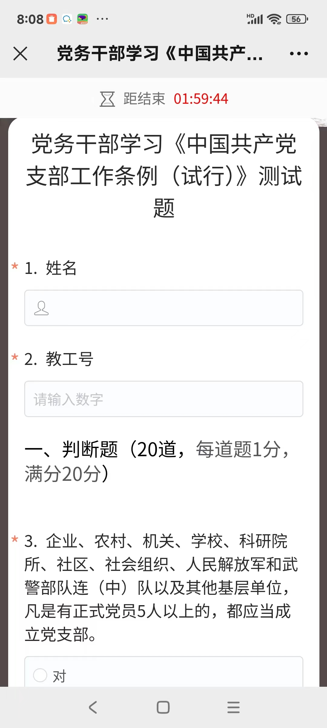 为进一步贯彻落实好《中国共产党支部工作条例(试行)》,规范基层党支部建设,学校于近期组织开展了《中国共产党支部工作条例(试行)》线上统一考试,组织部、宣传部、统战部等党委部门全体干部及各党总支委员、党支部委员参加了考试。